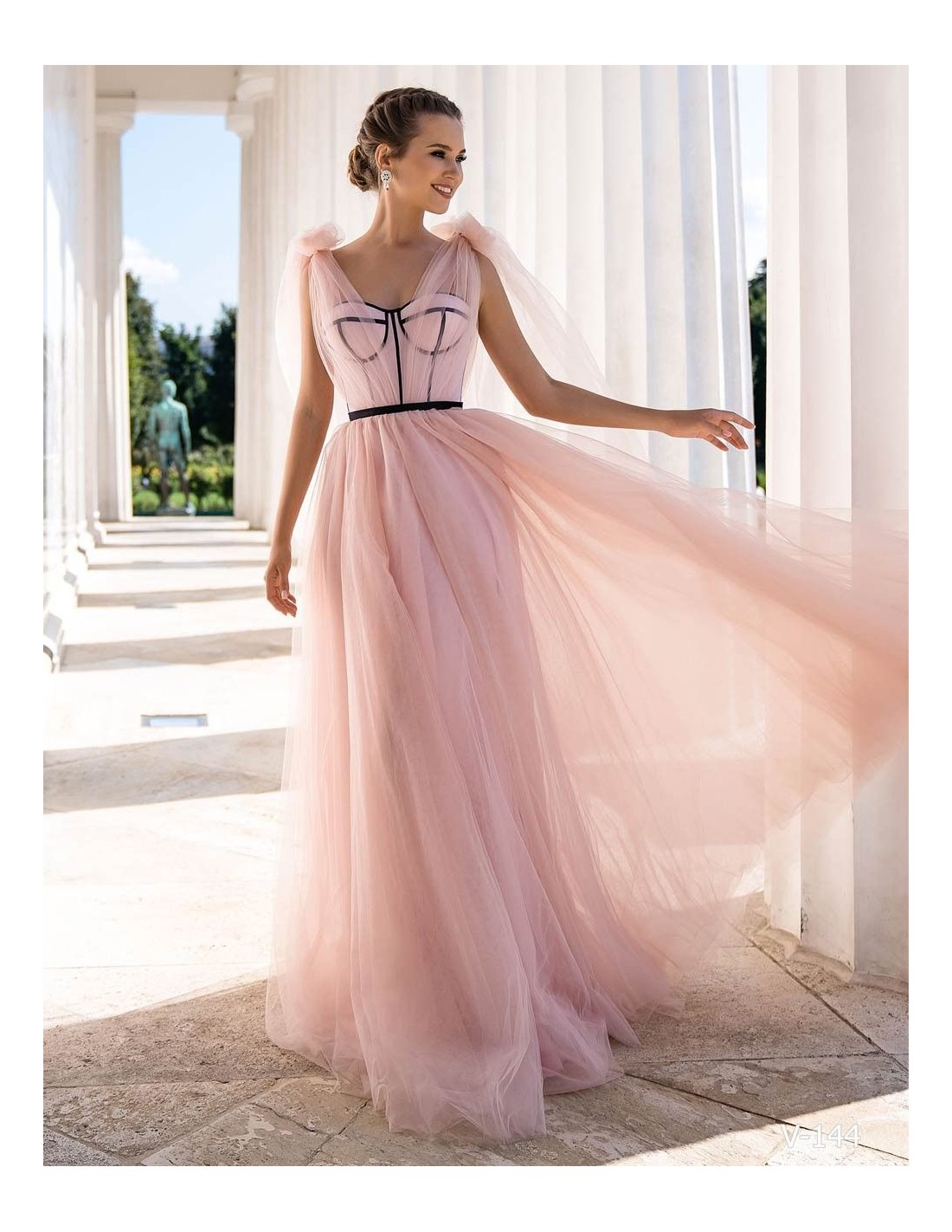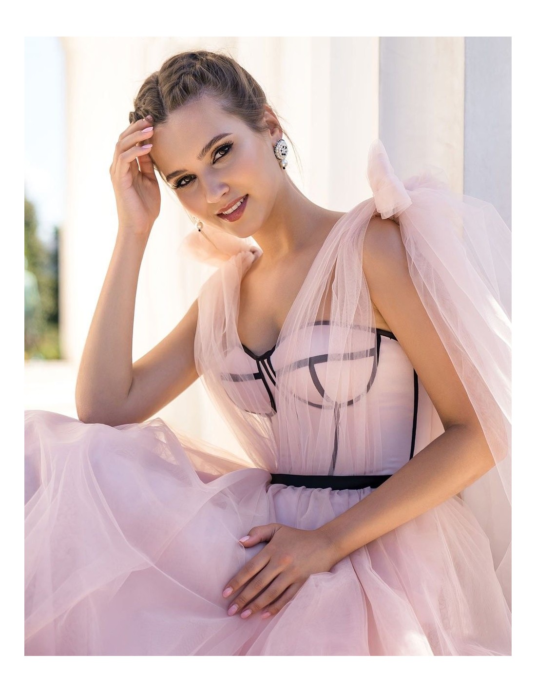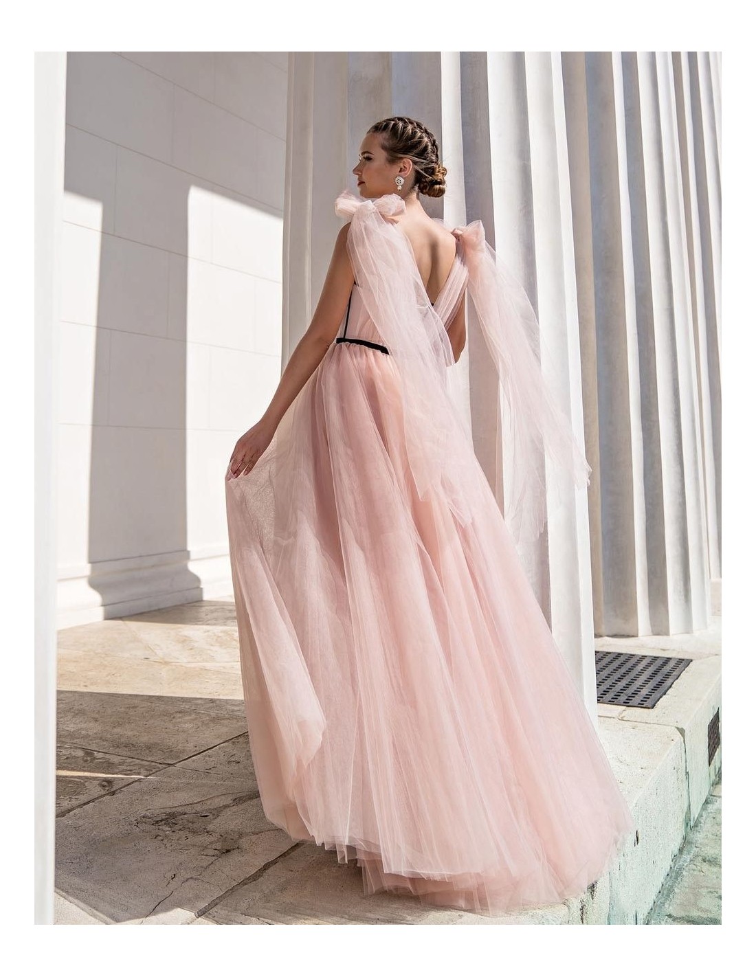 Cette spectaculaire robe d'invitée est présentée dans un délicat tissu de tulle rose poudré. Elle se compose d'un corsage corseté avec un biais noir et d'une longue Jupe avec plusieurs couches de tulle. Ce qui rend ce modèle spécial, ce sont ses bretelles à lacets que vous pouvez ajuster à votre convenance.