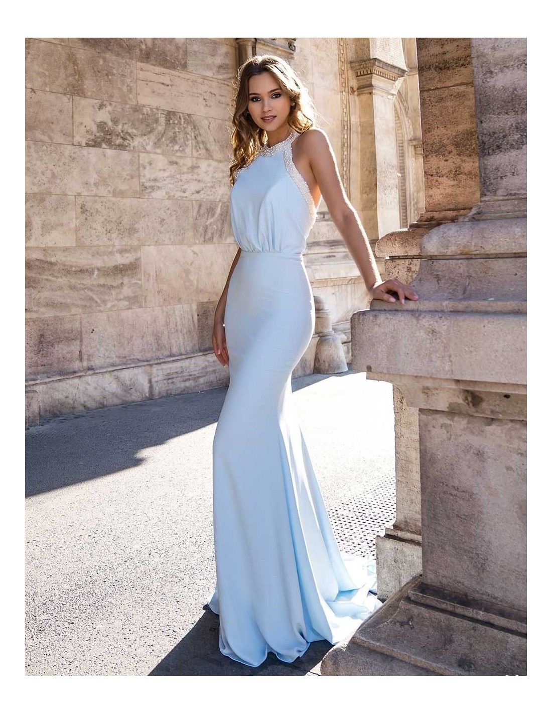 Robe longue de fête sophistiquée avec encolure licou embellie pour les événements spéciaux.