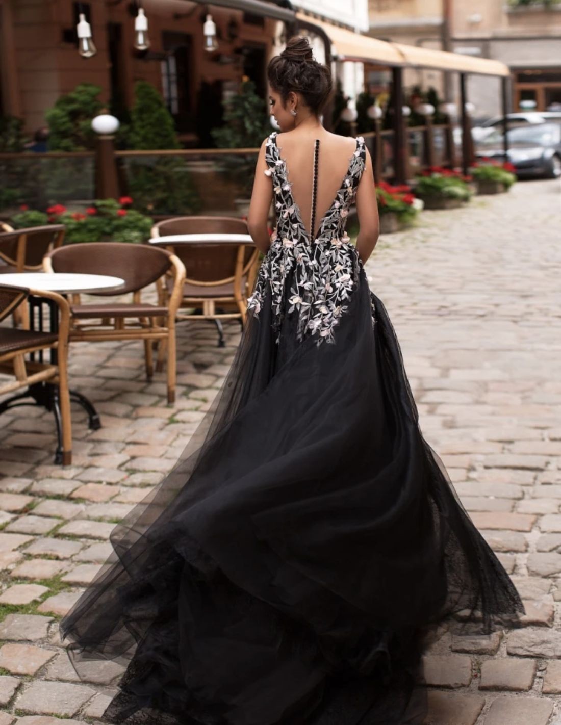 Cette robe de soirée pour invitée est confectionnée en tulle associé à de la dentelle colorée embellie de fleurs. Elle présente un décolleté plongeant avec bretelles, une maille nude au centre, un corsage brodé de fleurs terminé par une jupe en tulle noir. Elle se ferme au dos par des boutons recouverts et une fermeture éclair invisible.