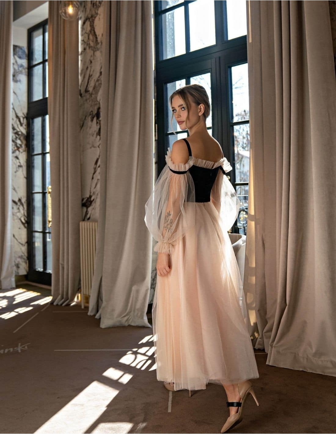 Spectaculaire robe en tulle à manches évêque et décolleté plongeant pour les grandes occasions.