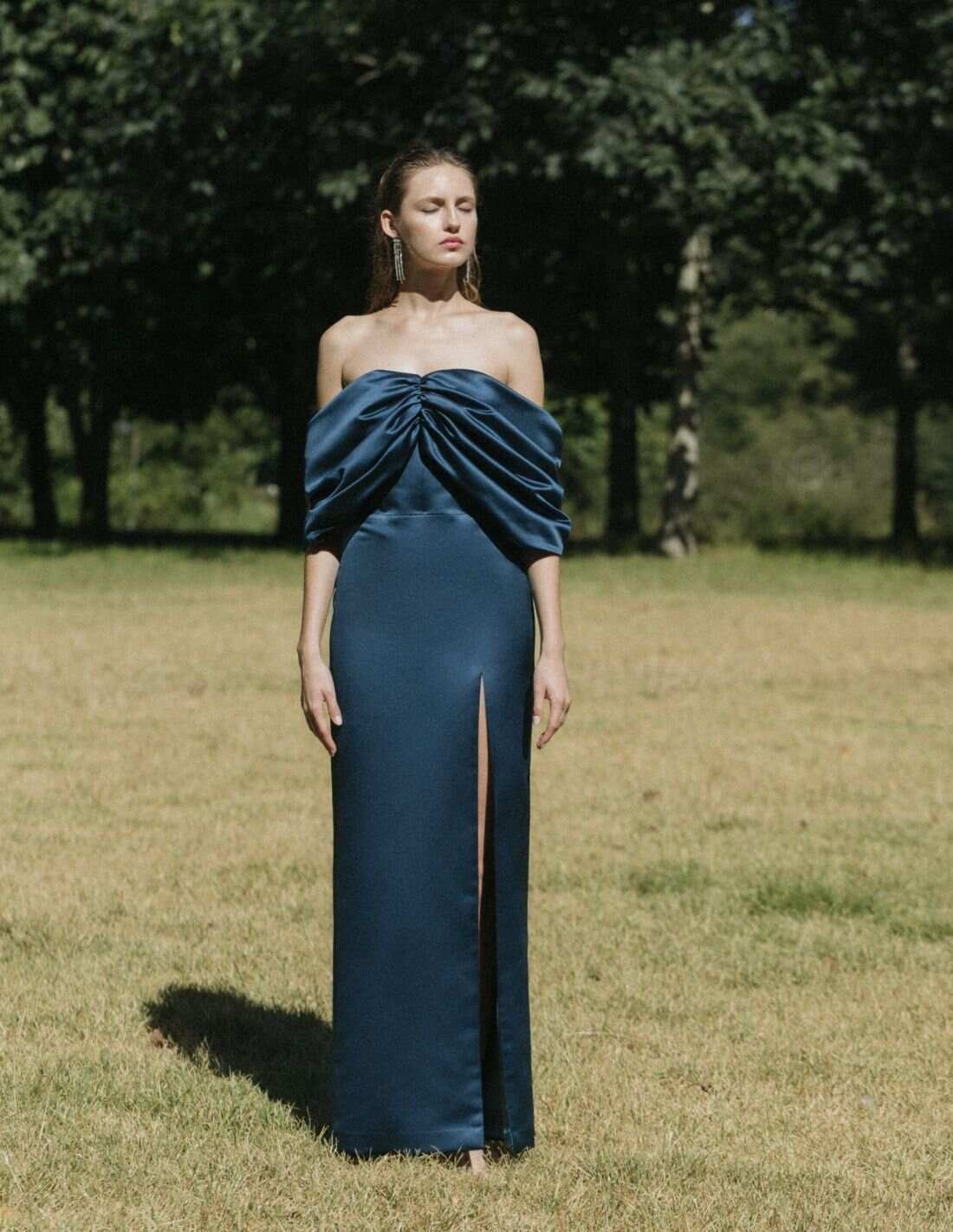 Élégante robe longue en satin bleu marine à encolure bardot pour les événements.