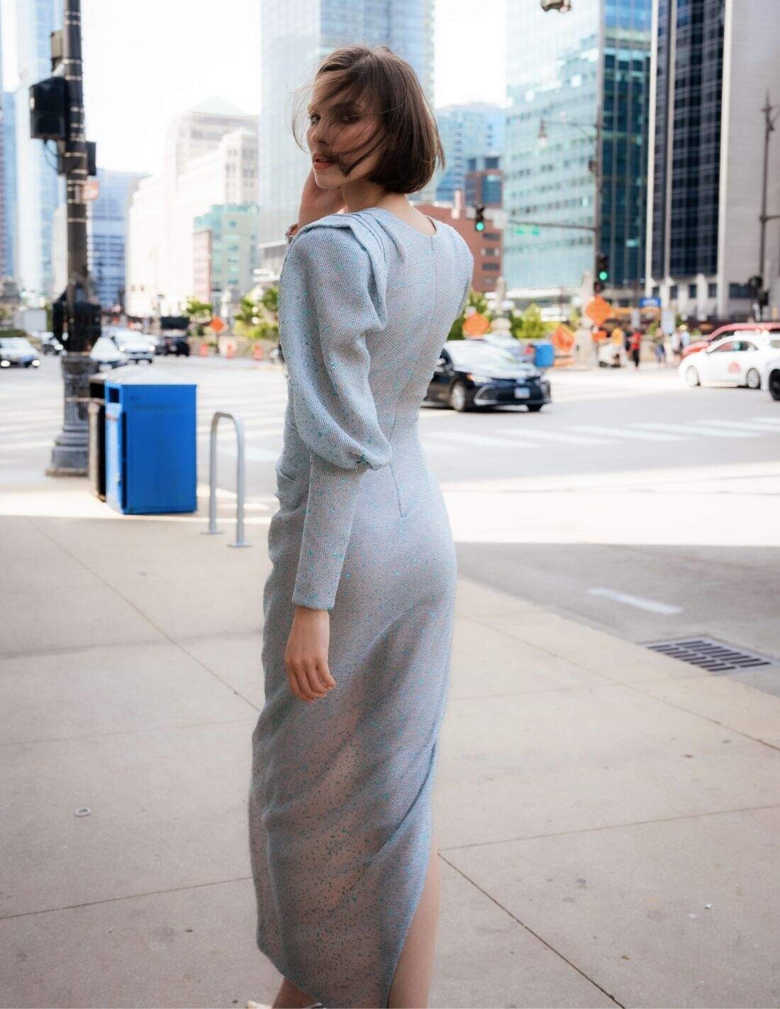 Robe longue de fête avec maxi fente latérale et manches bouffantes