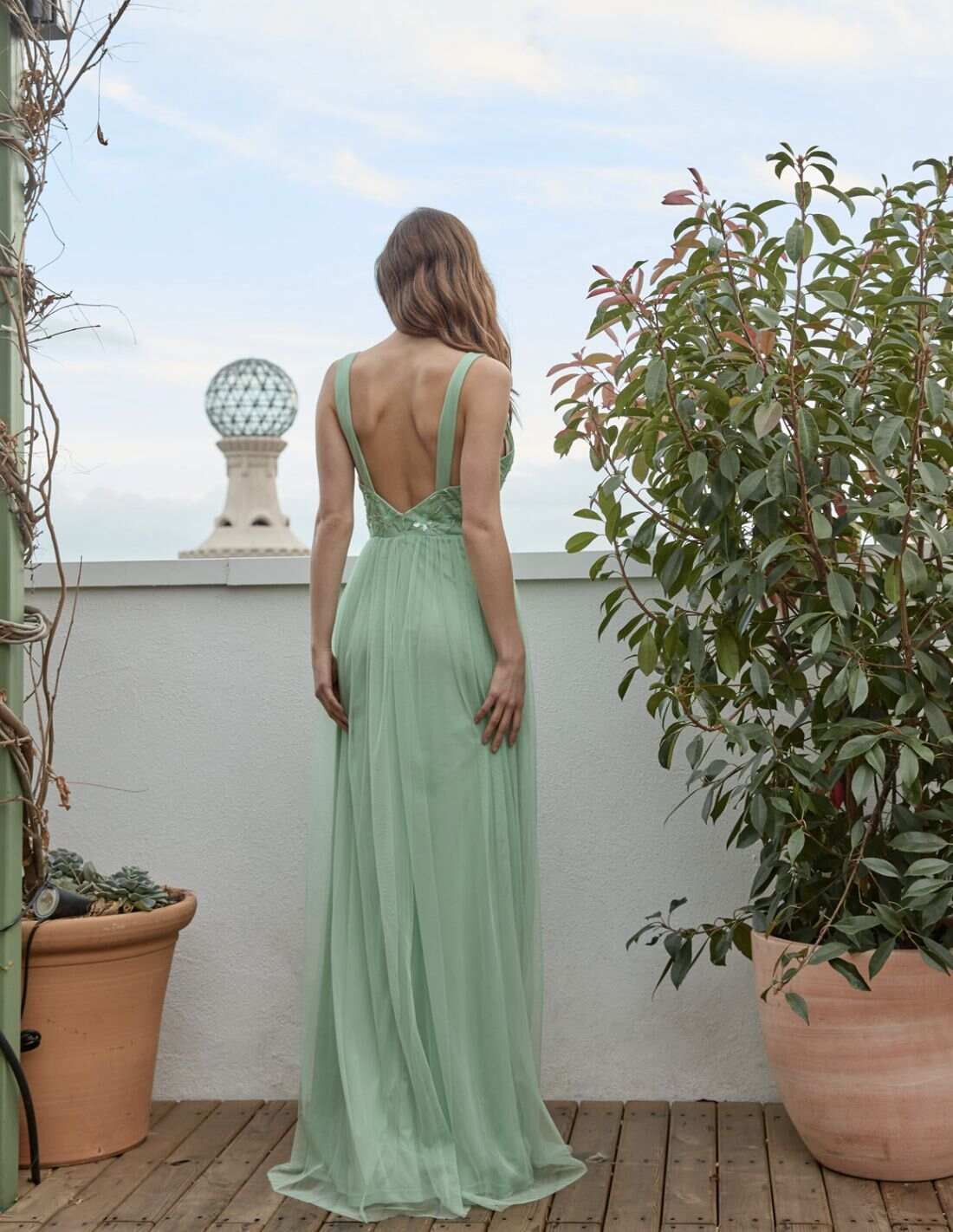 Cette robe de mariée ou d'invitée est confectionnée en tulle délicat orné de strass et de perles. Elle est disponible en rose maquillage et en vert menthe, deux teintes idéales à porter à tout moment de l'année.