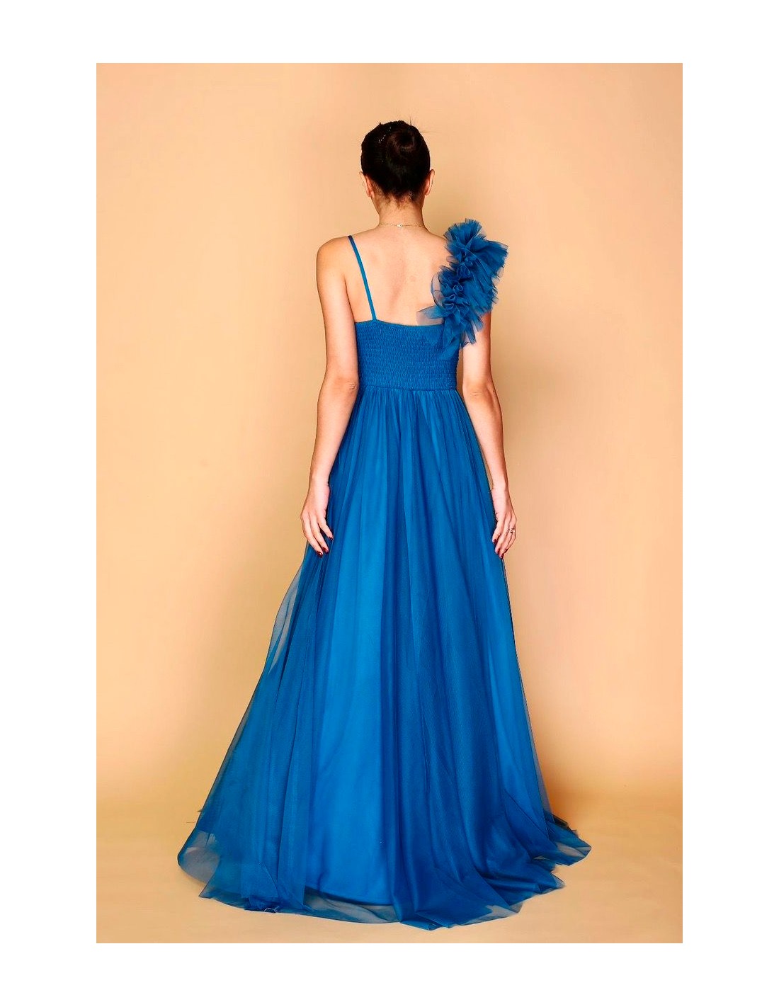 Le détail sur l'épaule droite est idéal et lui donne une touche élégante et romantique que vous adorerez. La coupe empire de la poitrine, mettra en valeur votre silhouette et est complétée par une ouverture infinie dans la jupe. Cette robe de soirée en tulle ne passera certainement pas inaperçue.