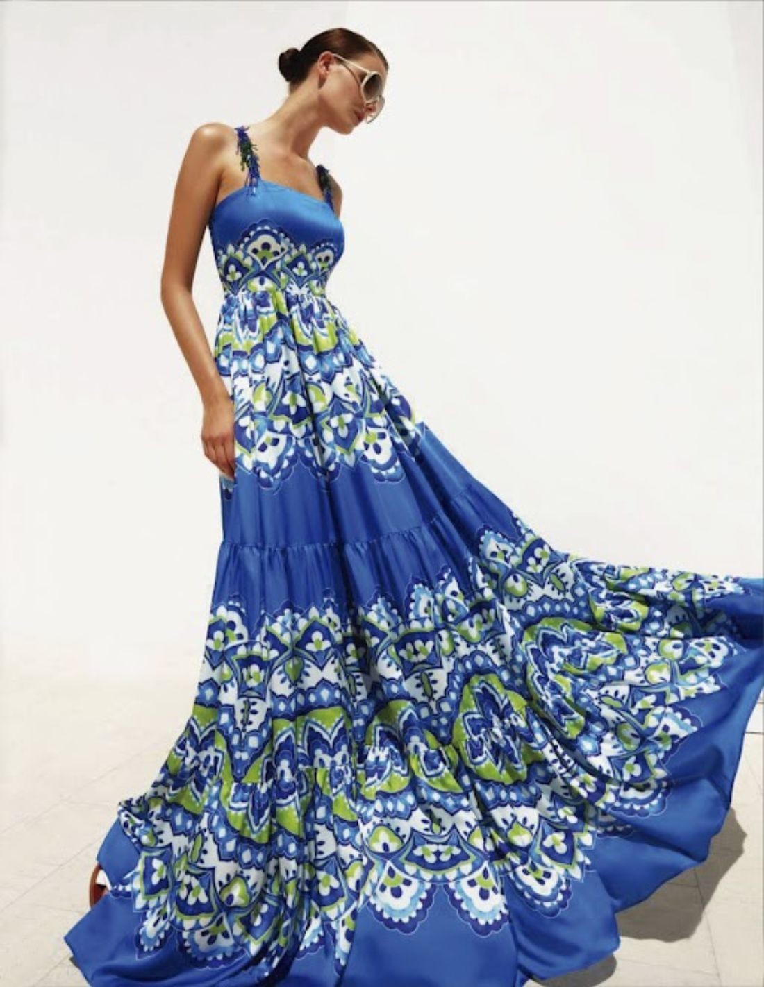 Robe longue imprimée bleue avec bretelles décorées pour les grandes occasions.