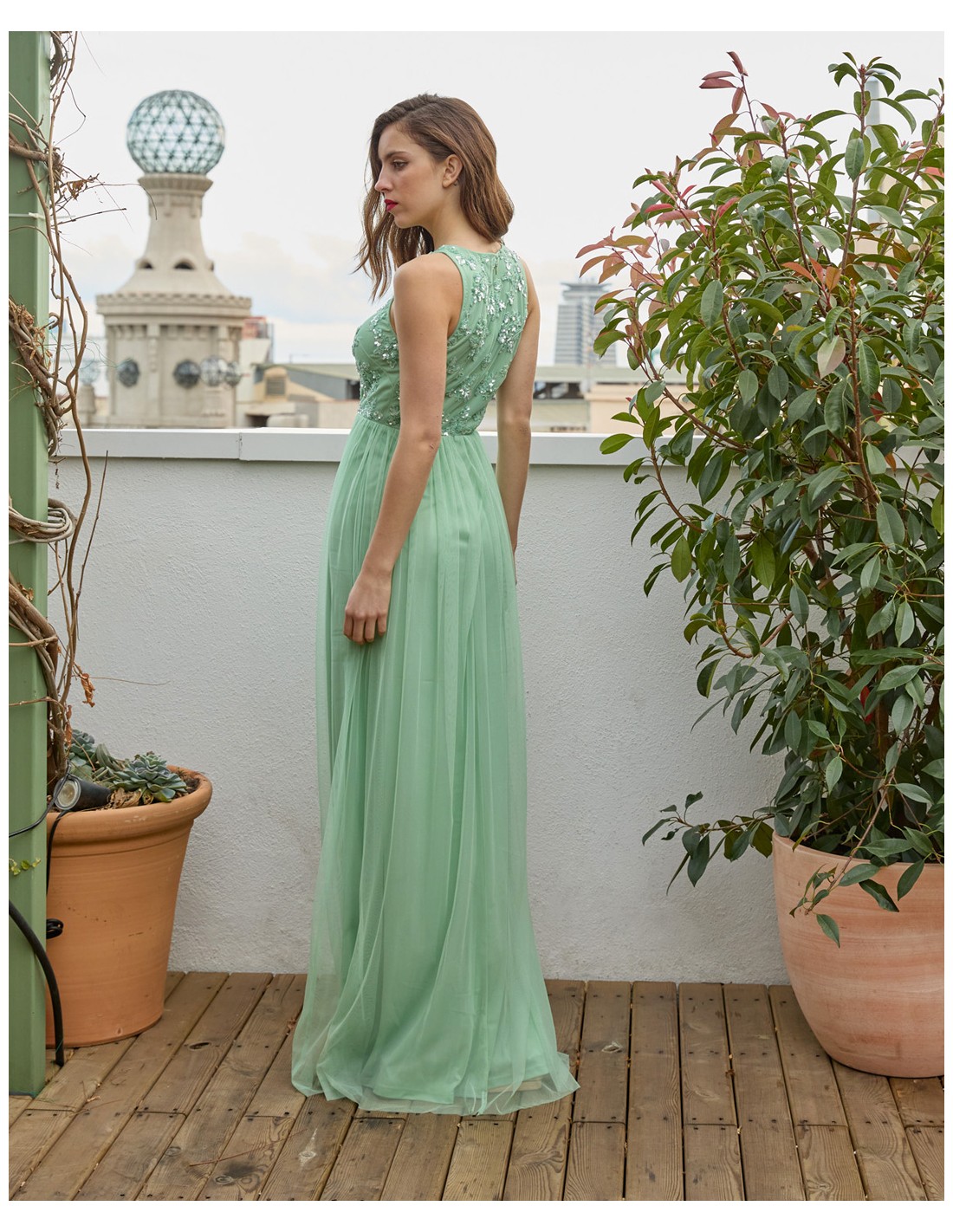 Un modèle idéal pour les soirées, mais aussi comme demoiselle d'honneur ou sœur des mariés. Disponible en menthe et en rose fuchsia. Ces deux couleurs sont très tendance et très flatteuses. Le corps est orné de détails en strass qui le rendent très spécial et élégant. La jupe, avec des couches de tulle, permet l'effet de mouvement lors de la marche, nous l'adorons !
