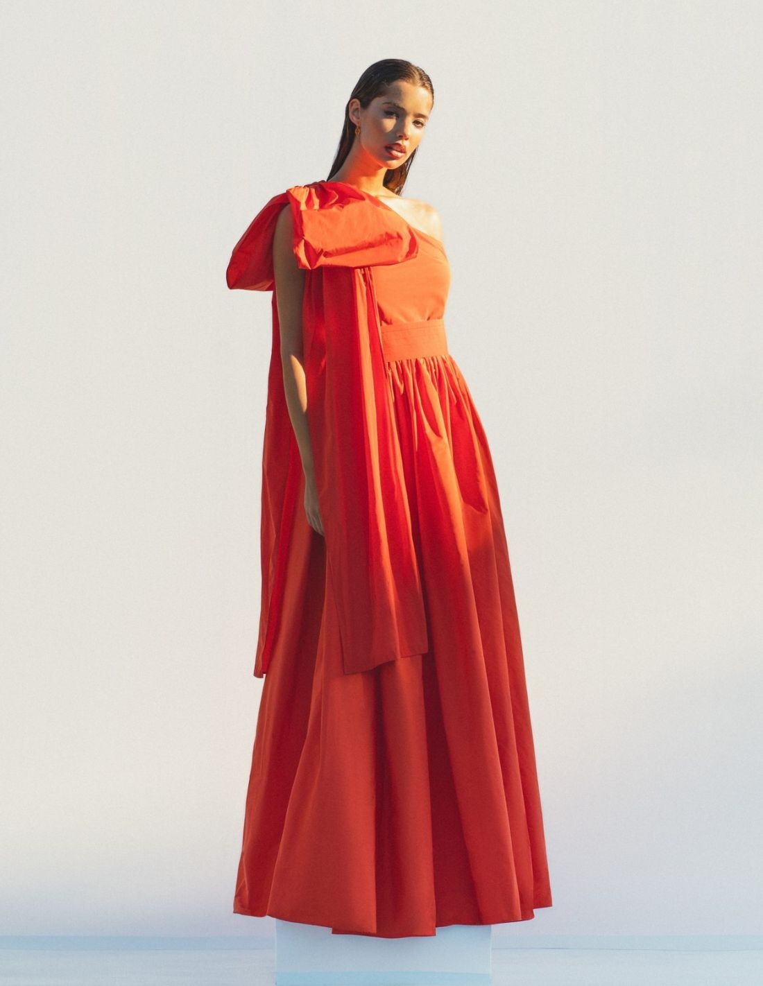 Cette robe d'invité est présentée dans un tissu taffetas orange très flatteur. Elle présente une encolure asymétrique avec un lien sur l'épaule, une taille large et une longue jupe froncée. Elle se ferme à l'aide d'une fermeture éclair invisible.