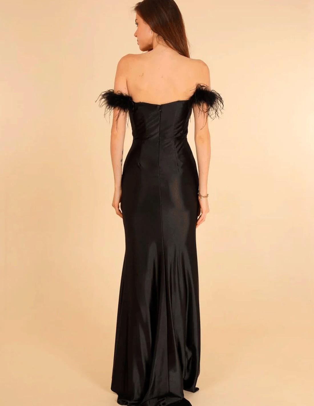Robe longue en satin avec encolure bandeau et détails en plumes