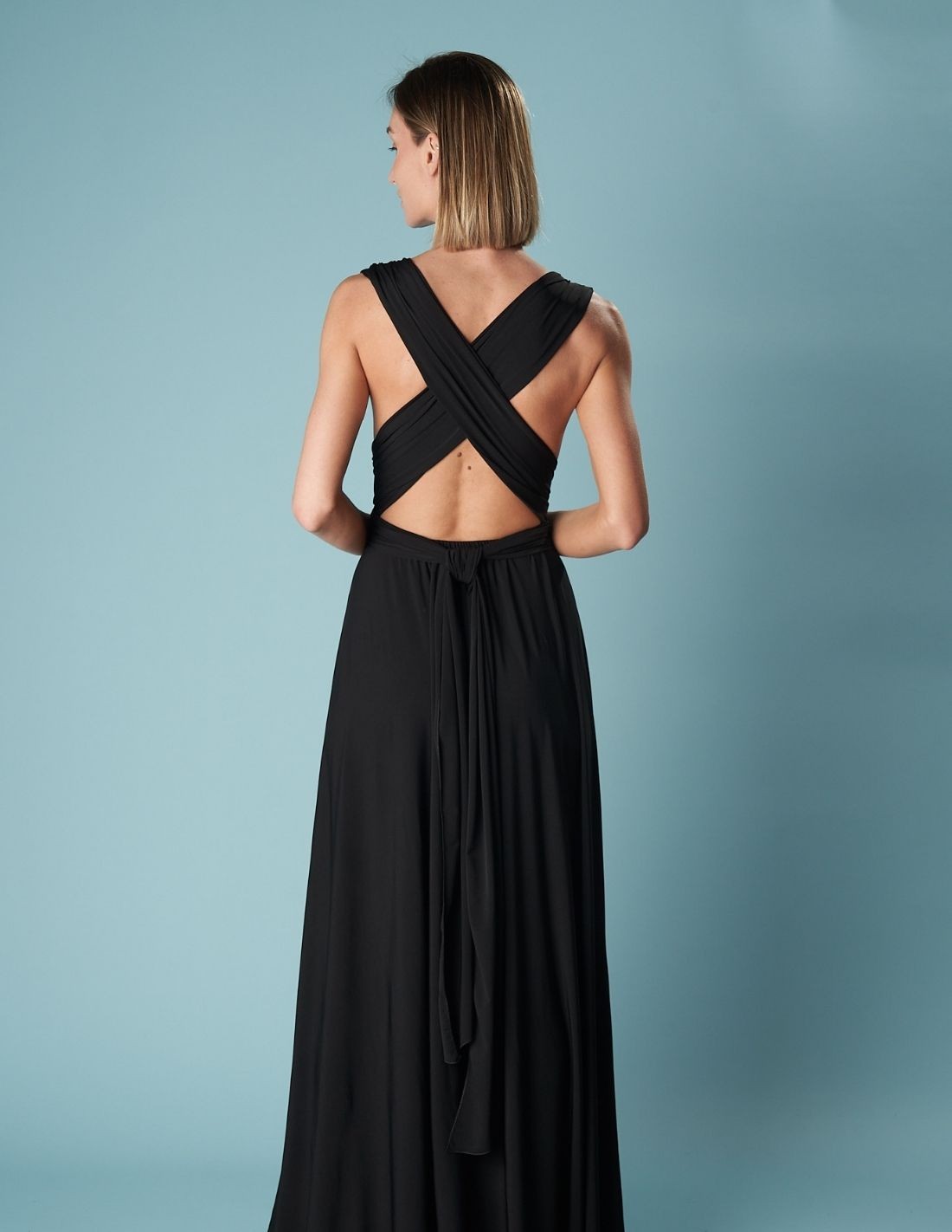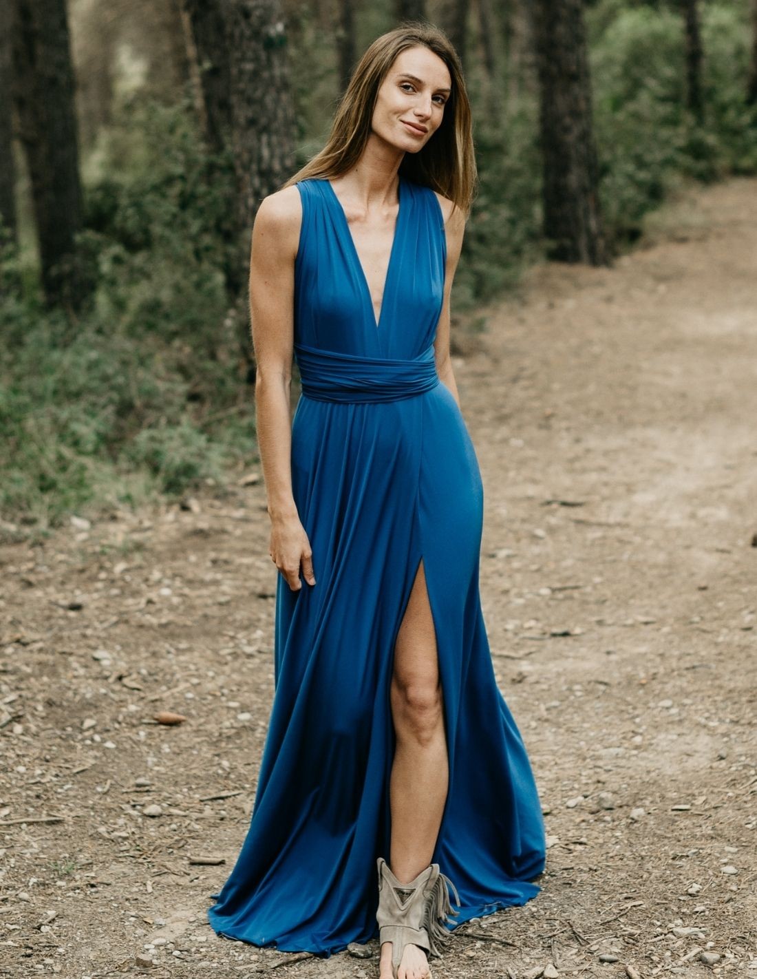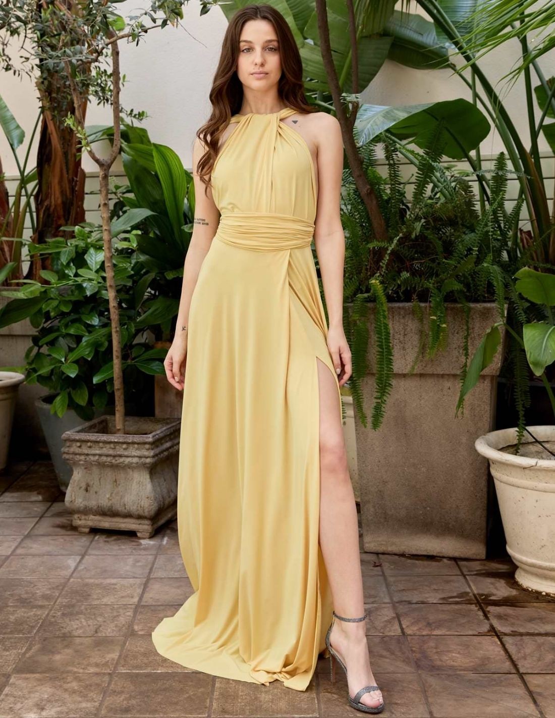 Robe longue de fête multipositions avec fente latérale pour les grandes occasions.