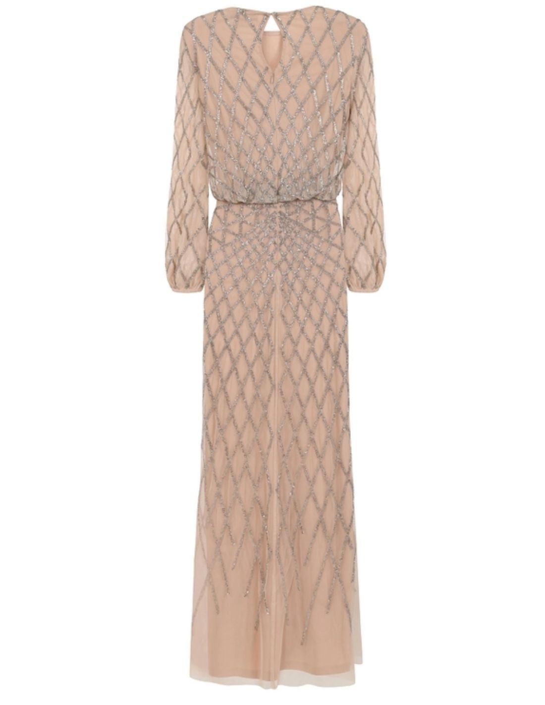 Cette robe d'invitée spéciale élégante et sophistiquée est confectionnée dans une base de crêpe nude associée à des sequins argentés dans un motif intrinsèque.
