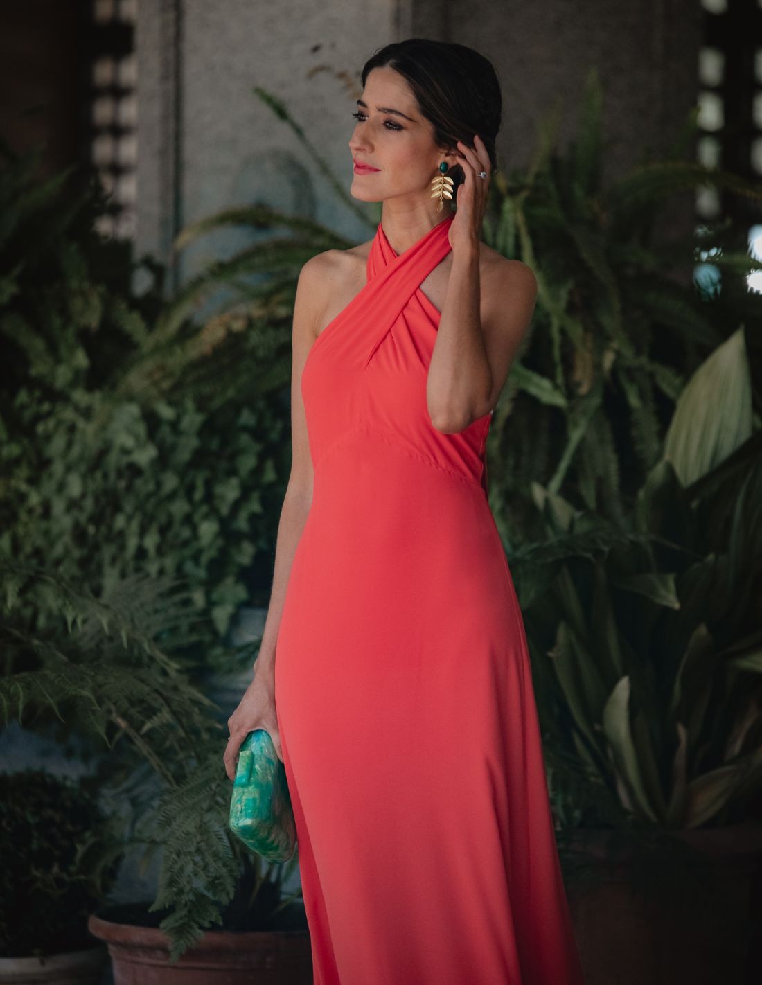 Robe longue de fête avec encolure dos nu croisée pour les occasions spéciales de l'après-midi et du soir.