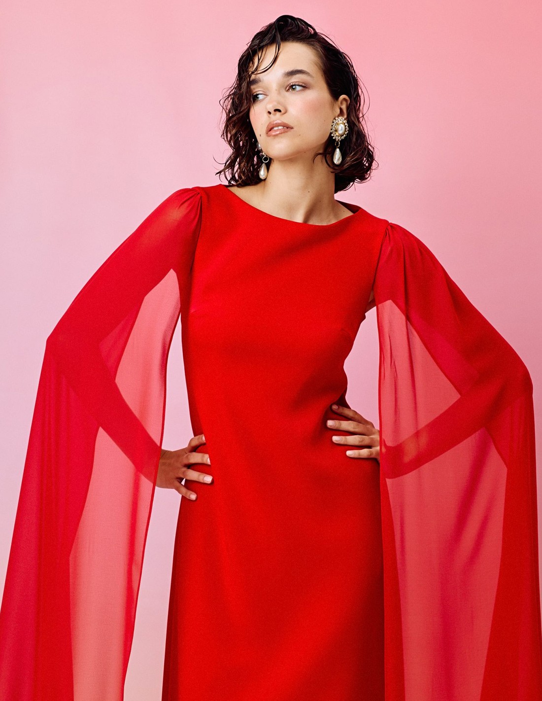 Robe longue de fête à manches cape et col rond de couleur rouge.