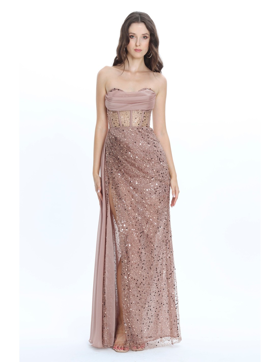 Robe longue de fête avec encolure sans bretelles et tissu scintillant