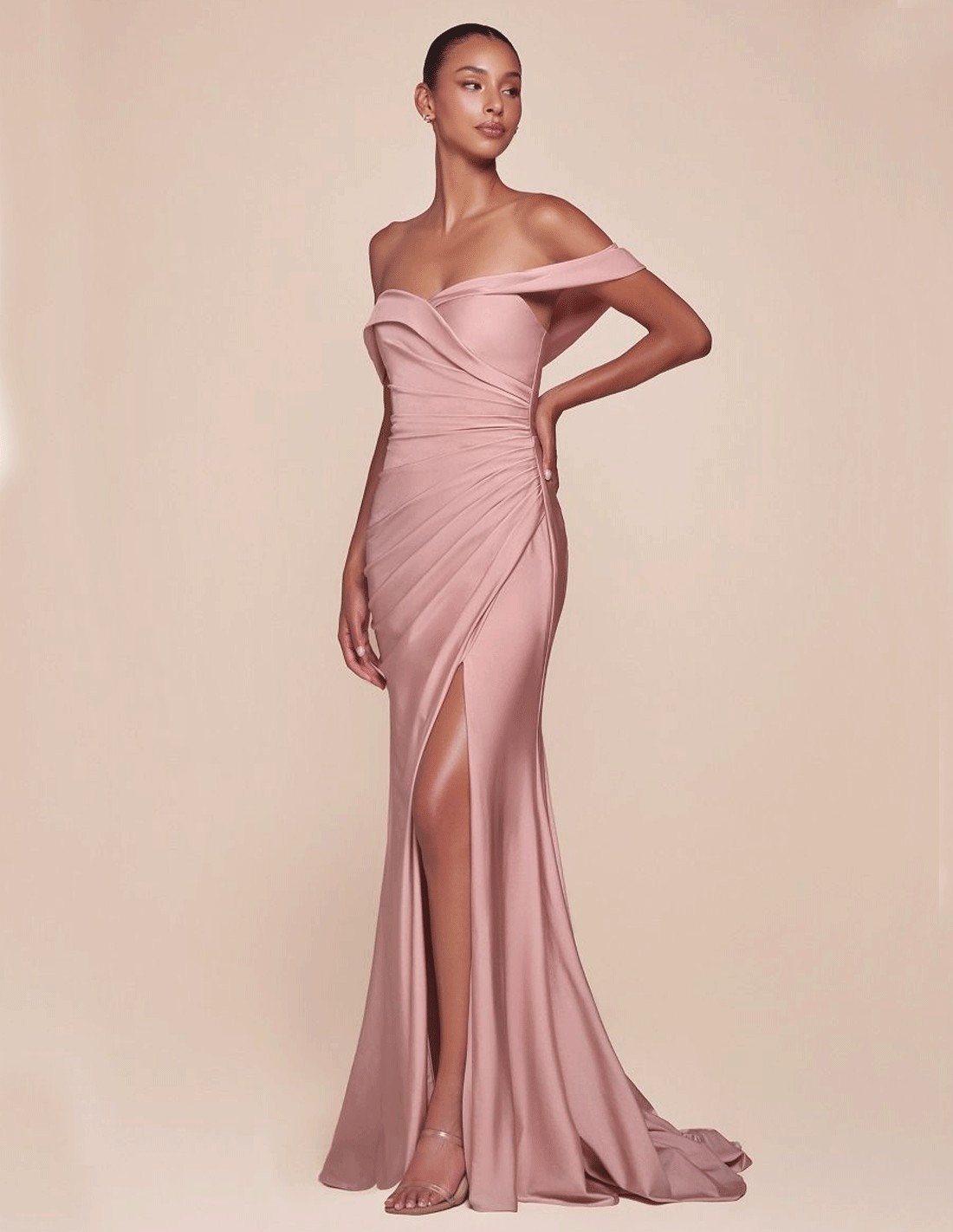 Longue robe de fête en satin avec encolure bandeau pour invitée