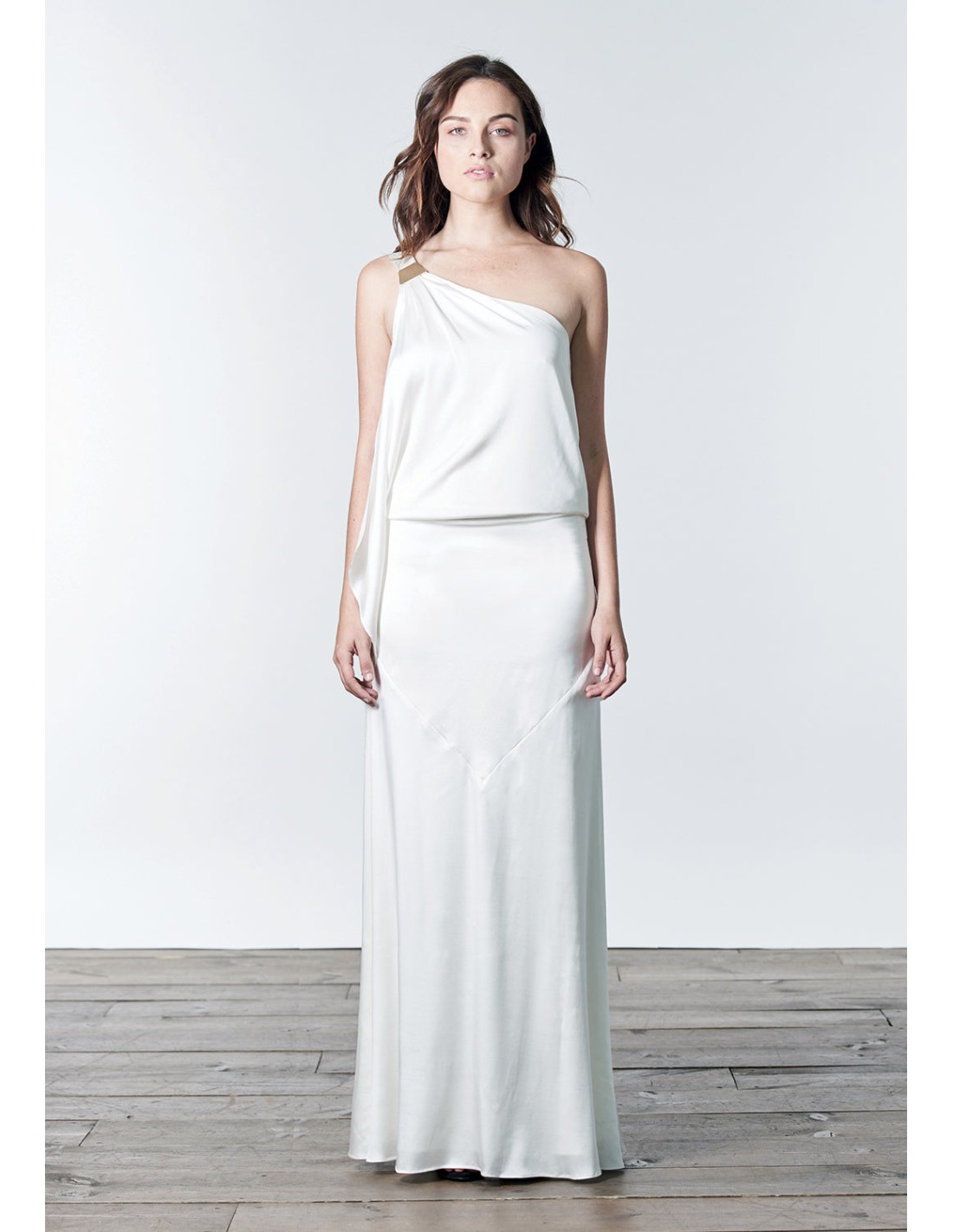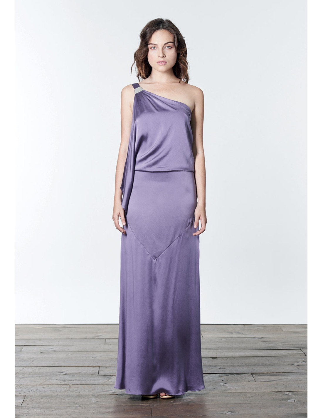 Vestido largo de satén con escote asimétrico