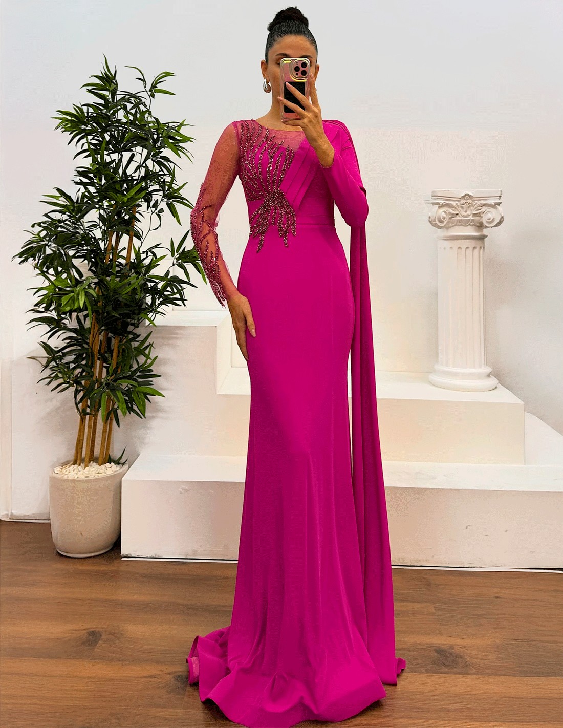 Robe de soirée longue avec strass sur le corsage et manches longues - Le choix idéal pour les invités spéciaux.