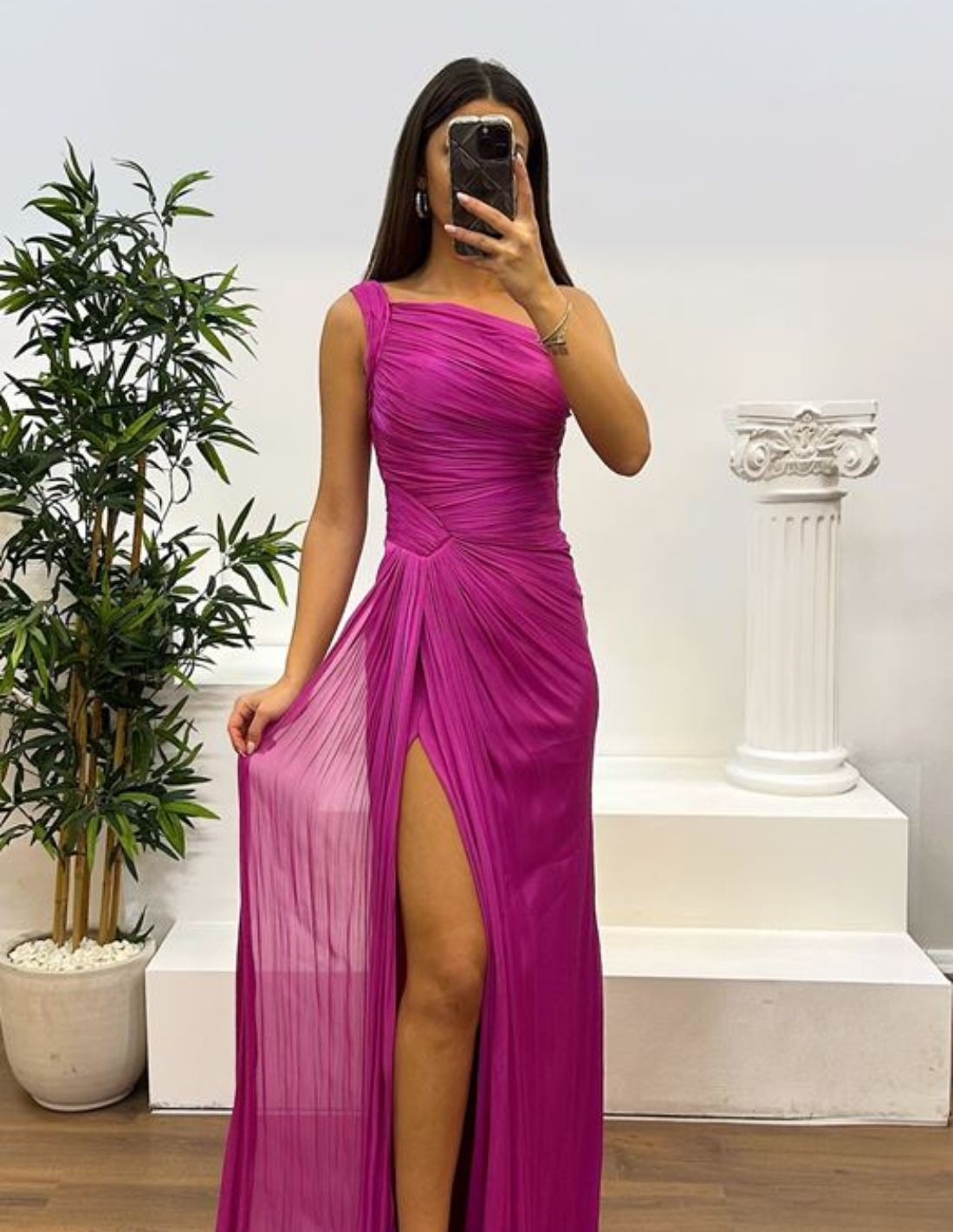 La robe de soirée longue plissée à encolure asymétrique est le choix idéal pour éblouir lors d'un événement spécial. Son design sophistiqué associe un tissu plissé élégant qui apporte mouvement et fluidité, à une encolure asymétrique qui met en valeur la silhouette féminine avec une touche de modernité et d'audace.