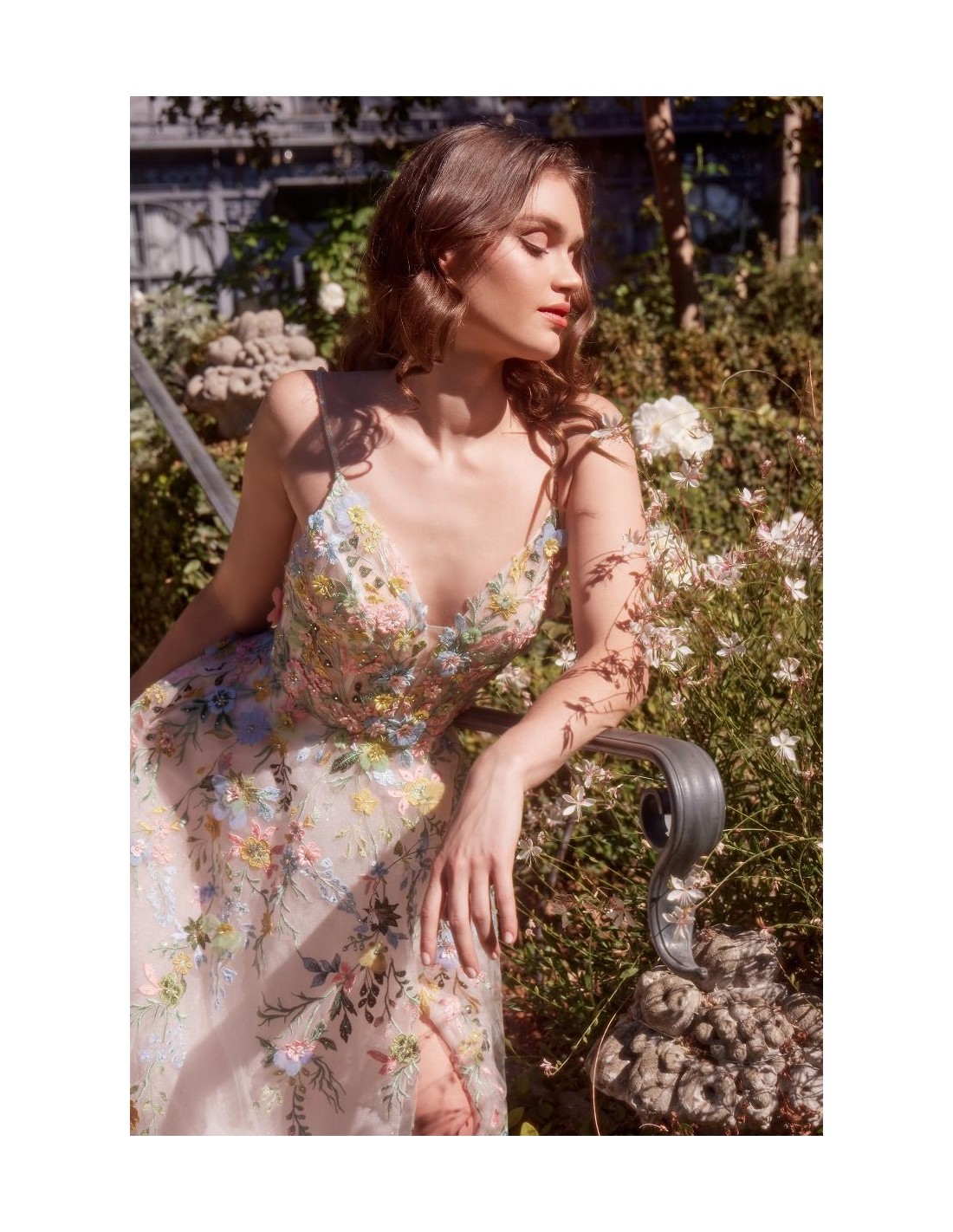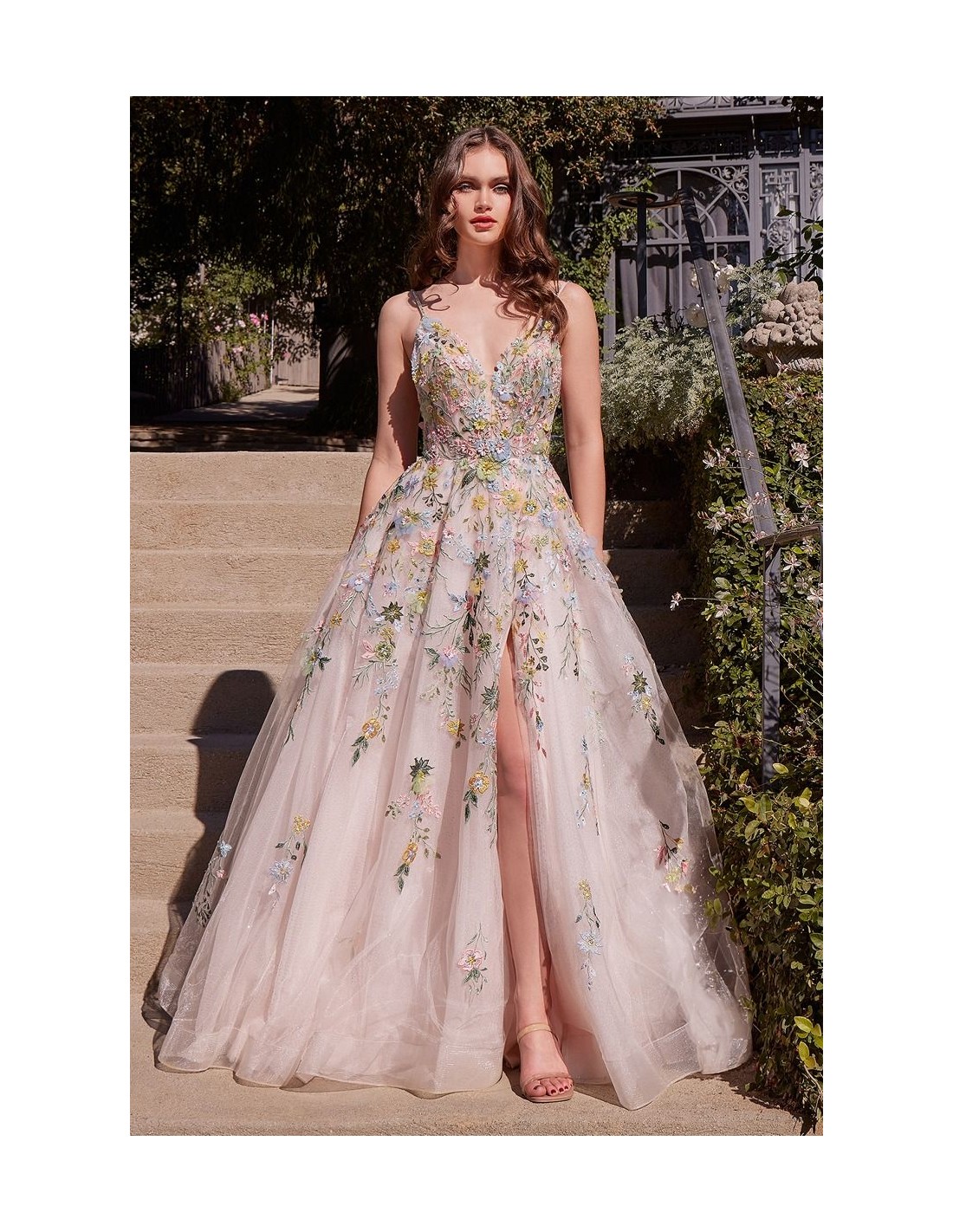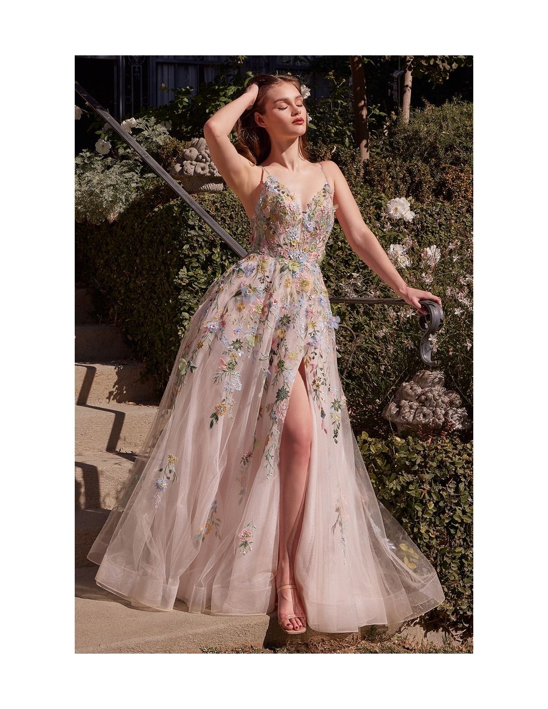 Éblouissante robe de soirée longue en tulle avec de délicates broderies florales multicolores réalisées à la main. Silhouette trapèze, décolleté en V, fines bretelles et ouverture élégante au niveau des jambes. Idéale pour les invitées, les mariées, les remises de diplômes et les événements formels. Cette robe d'invité est tout simplement parfaite.
