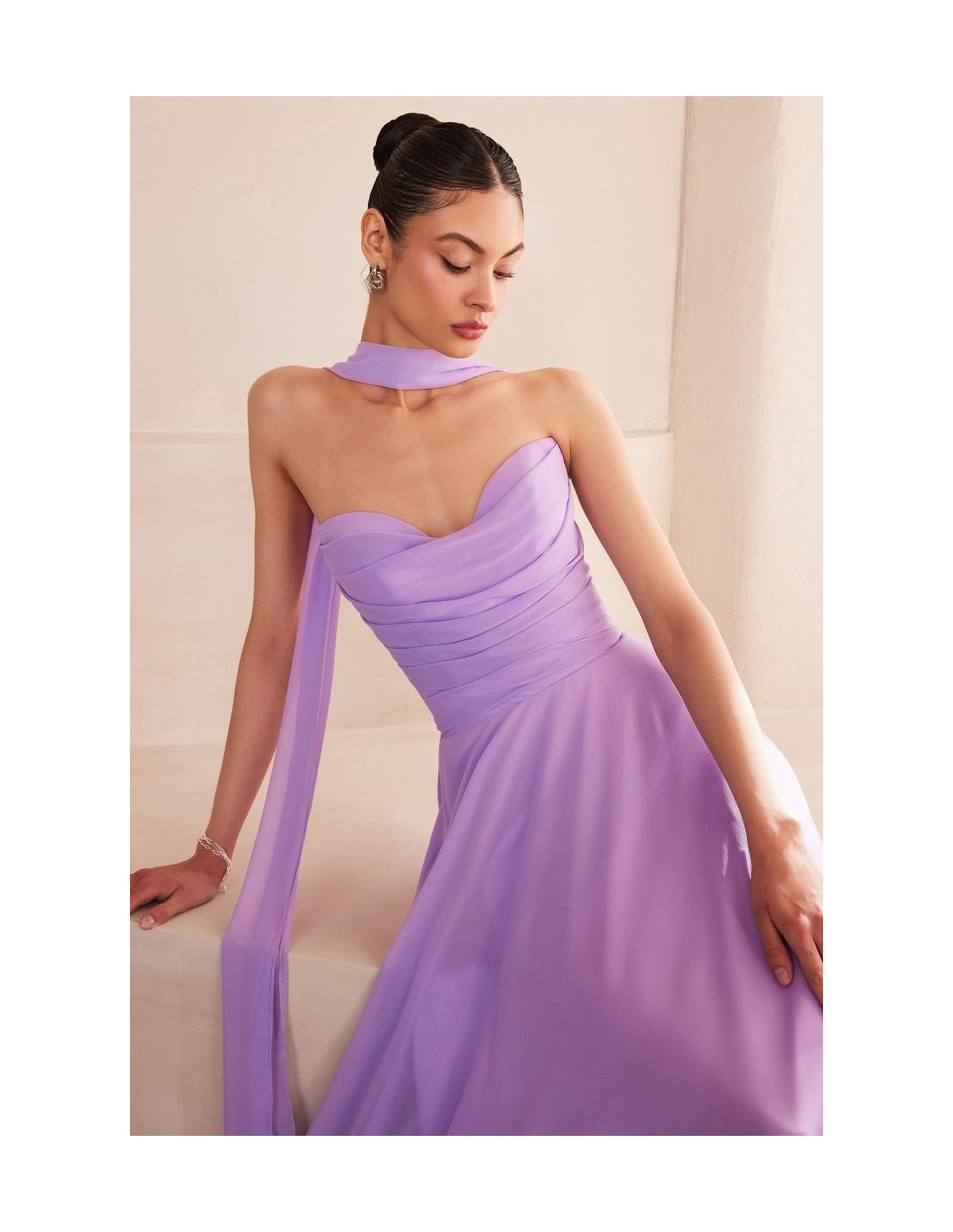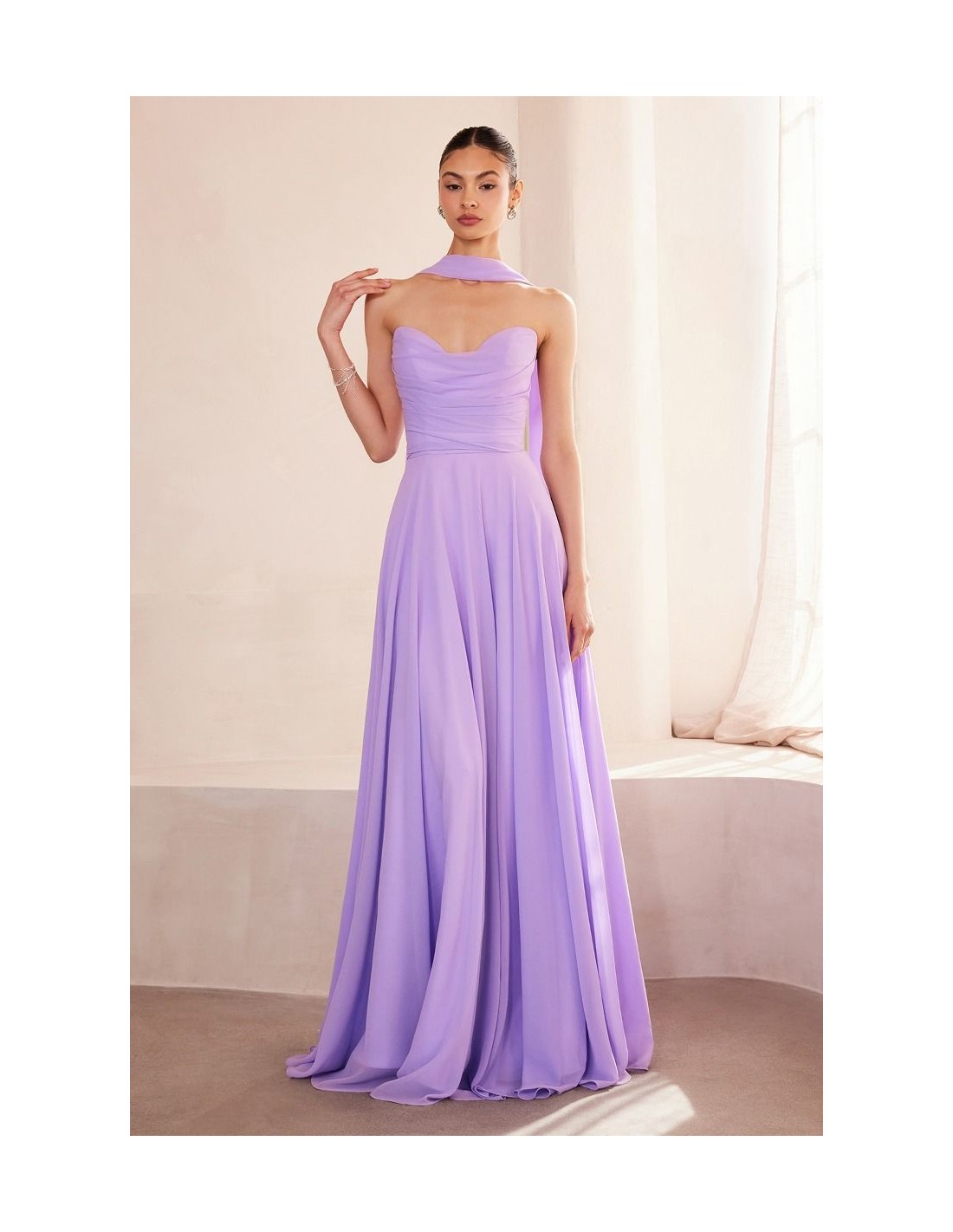 Longue robe d'invité sans bretelles avec châle assorti pour les mariages, les demoiselles d'honneur et les remises de diplômes.