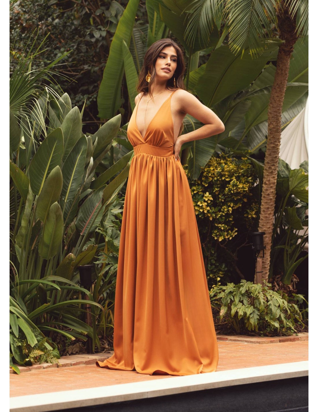 Robe longue en terre cuite avec décolleté plongeant et fines bretelles