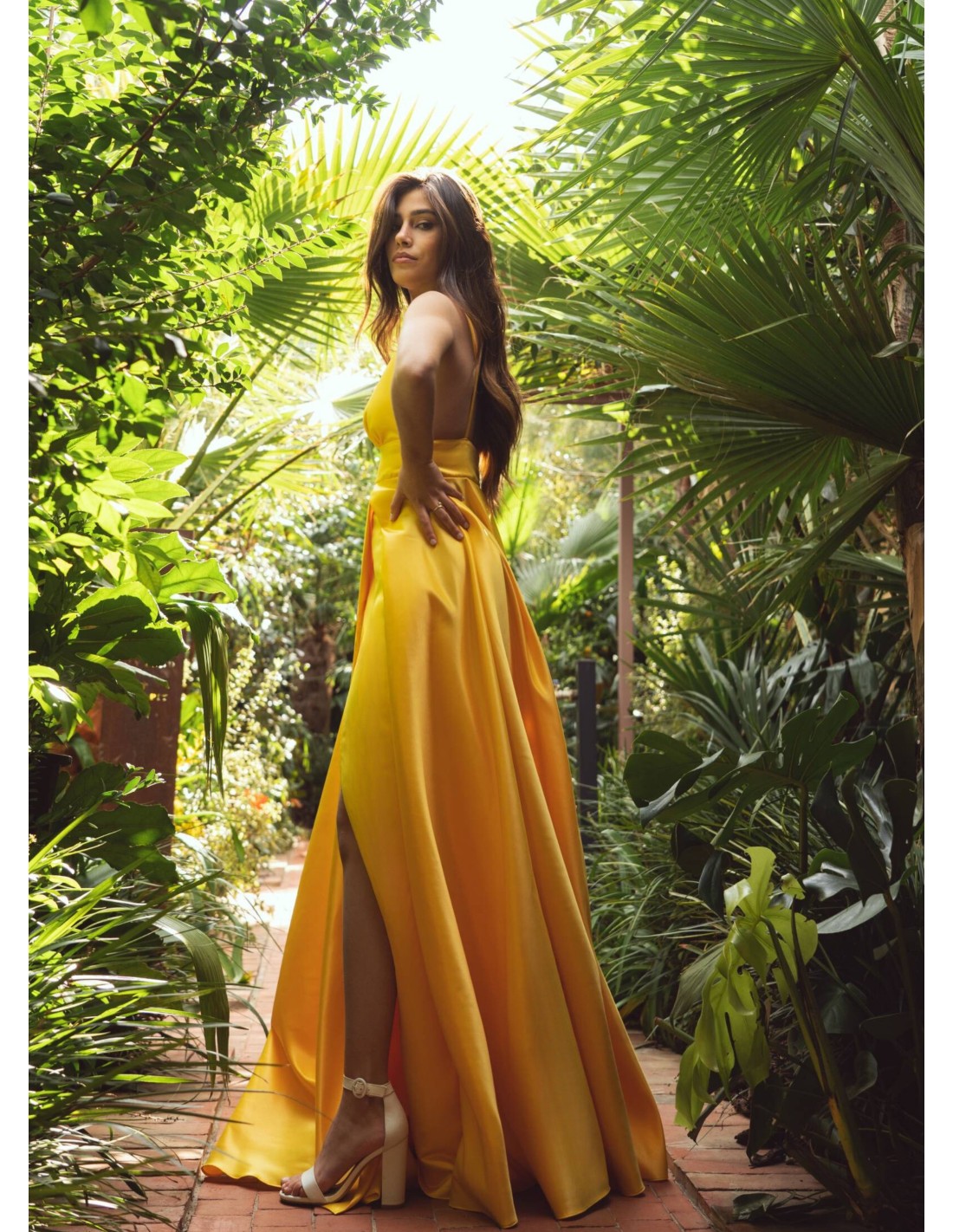 Longue robe jaune avec décolleté plongeant et coupe princesse