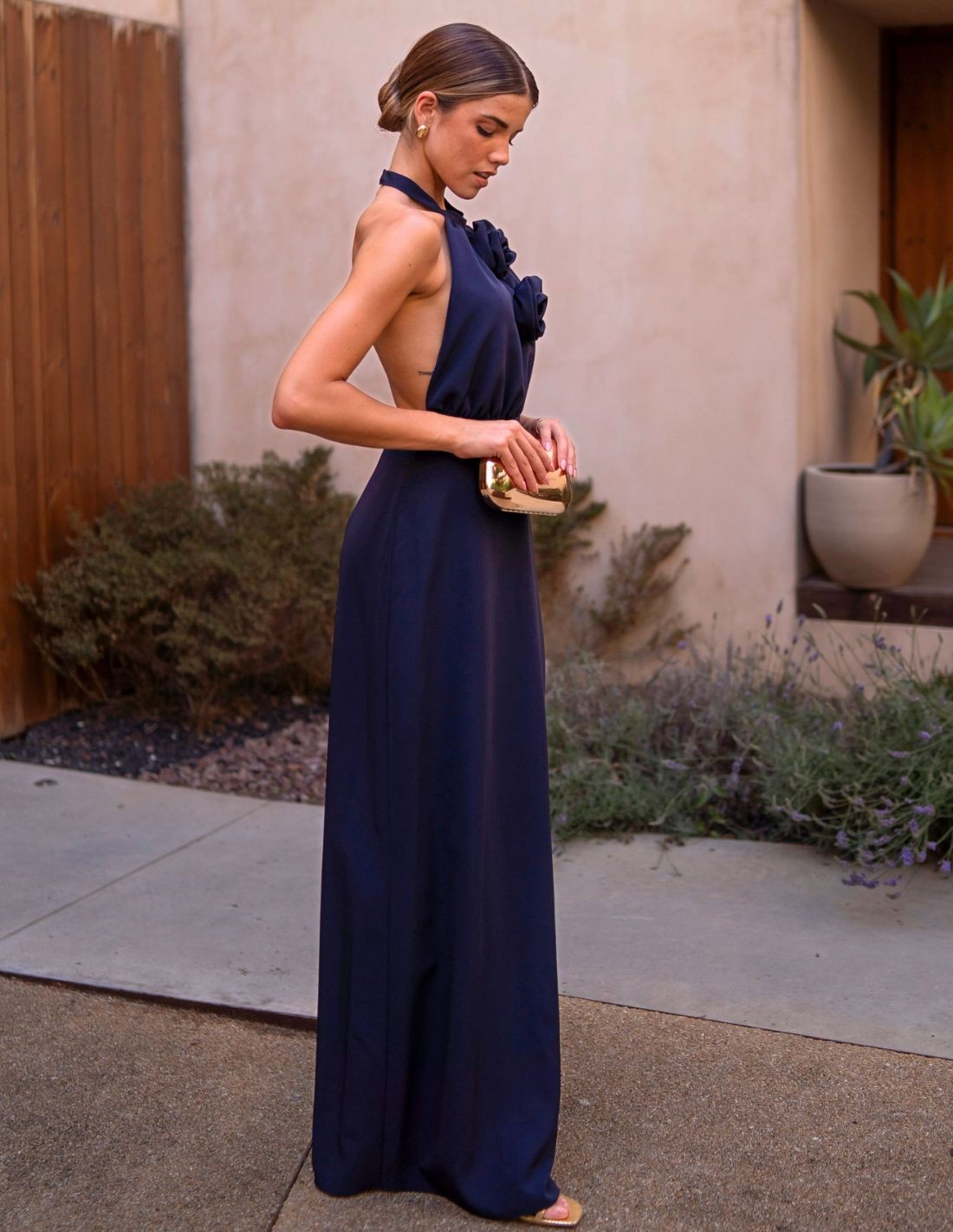 Vestido largo de invitada con escote halter y detalles de flores