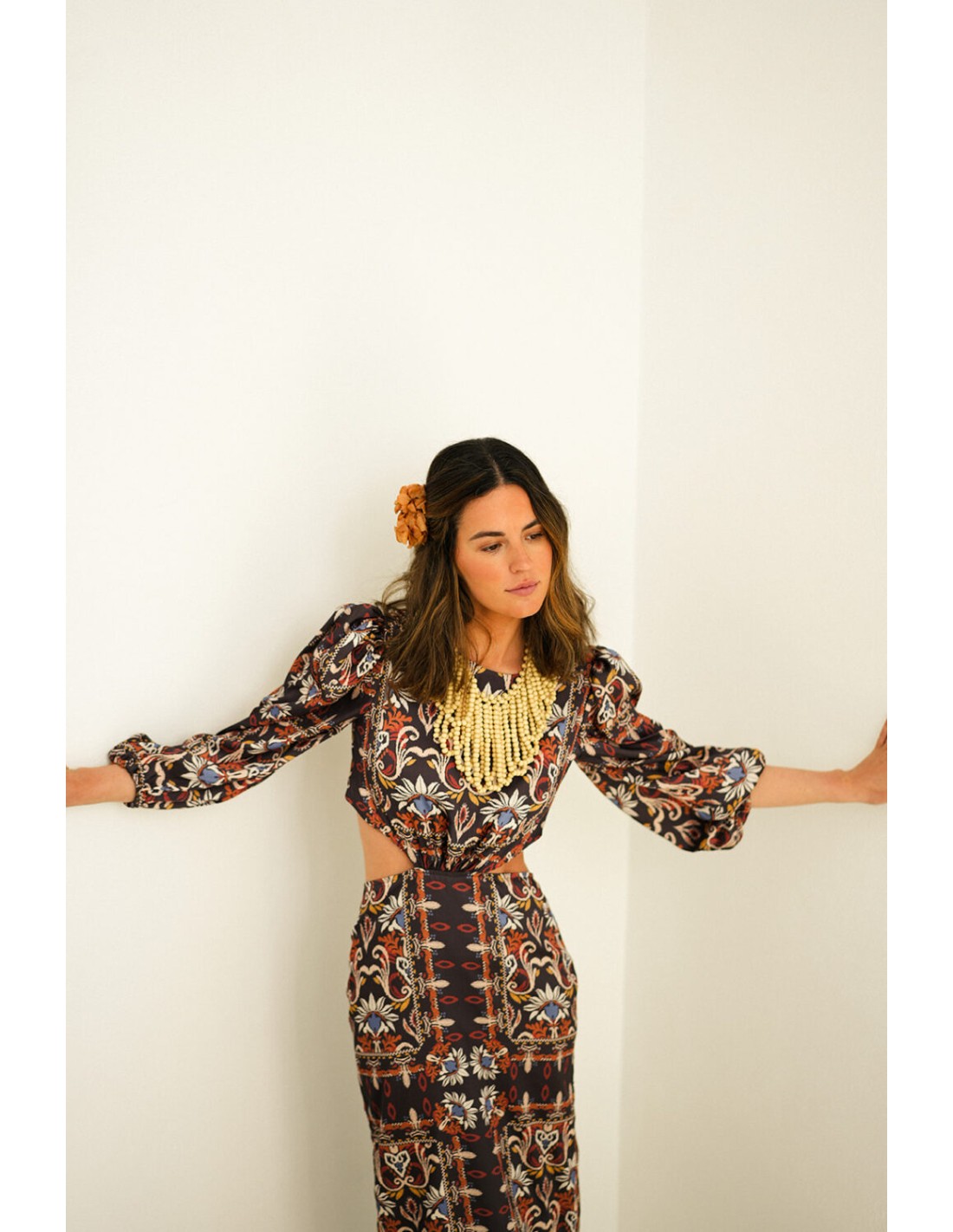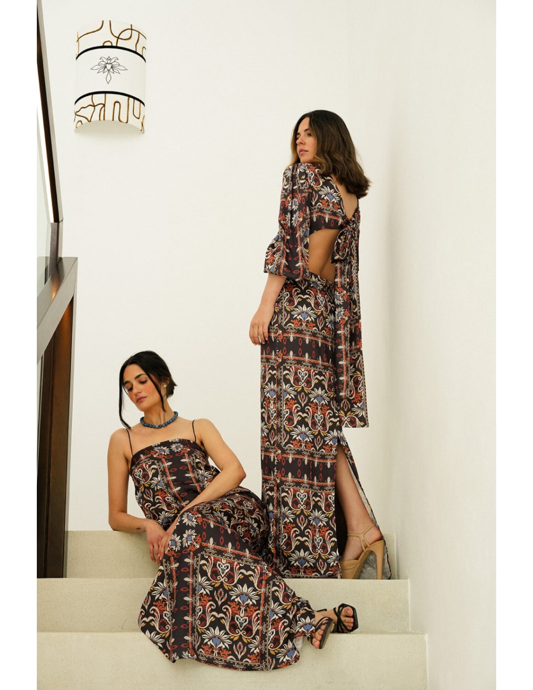 Robe longue découpée à imprimé ethnique avec manches françaises