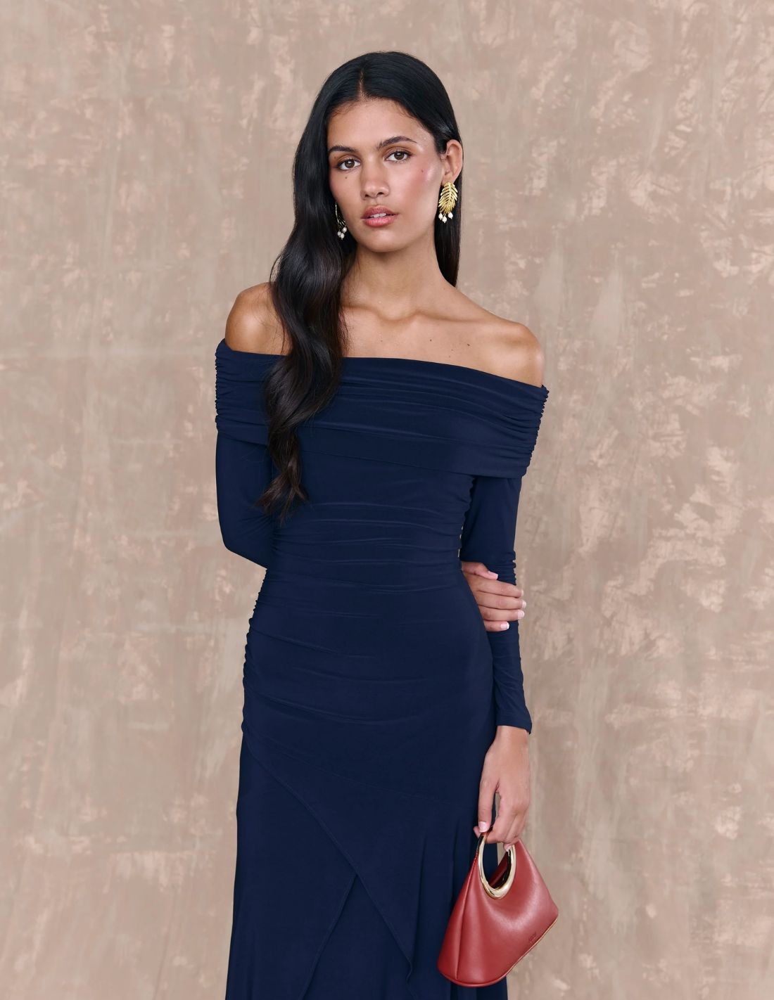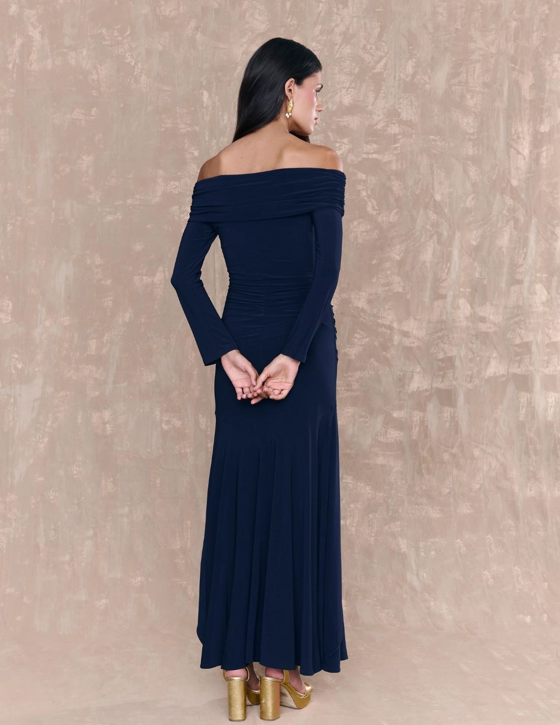 Vestido largo de invitada con manga larga y escote barco