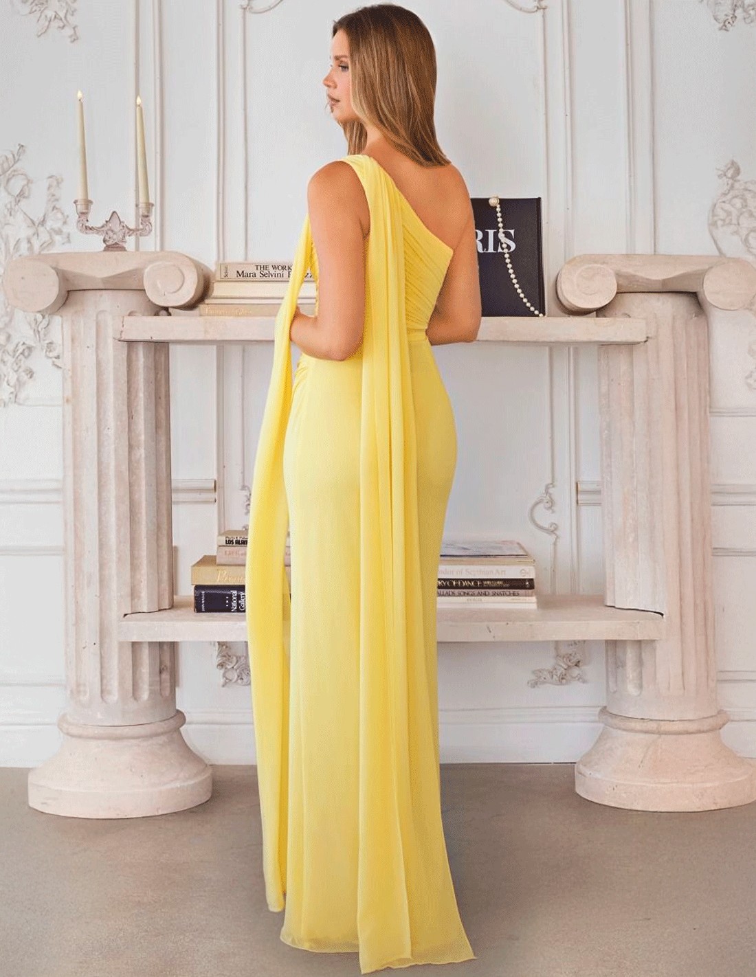 Robe de soirée longue avec encolure grecque asymétrique pour les invitées de mariage et les demoiselles d'honneur