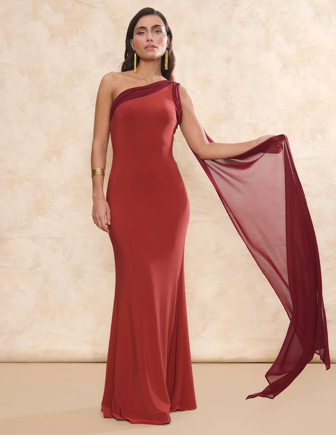 Longue robe d'invité en terre cuite avec encolure asymétrique et châle multipositions
