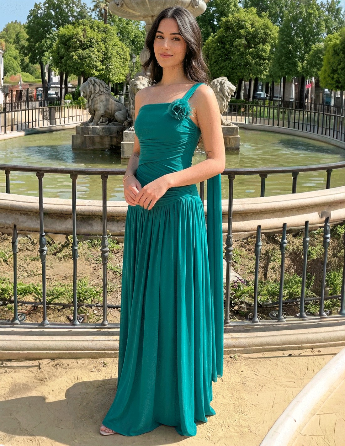 Robe longue en vert pétrole avec corsage drapé, jupe fluide et dos ajustable avec nœuds. Comprend une fleur décorative amovible qui peut également être utilisée comme accessoire pour les cheveux.