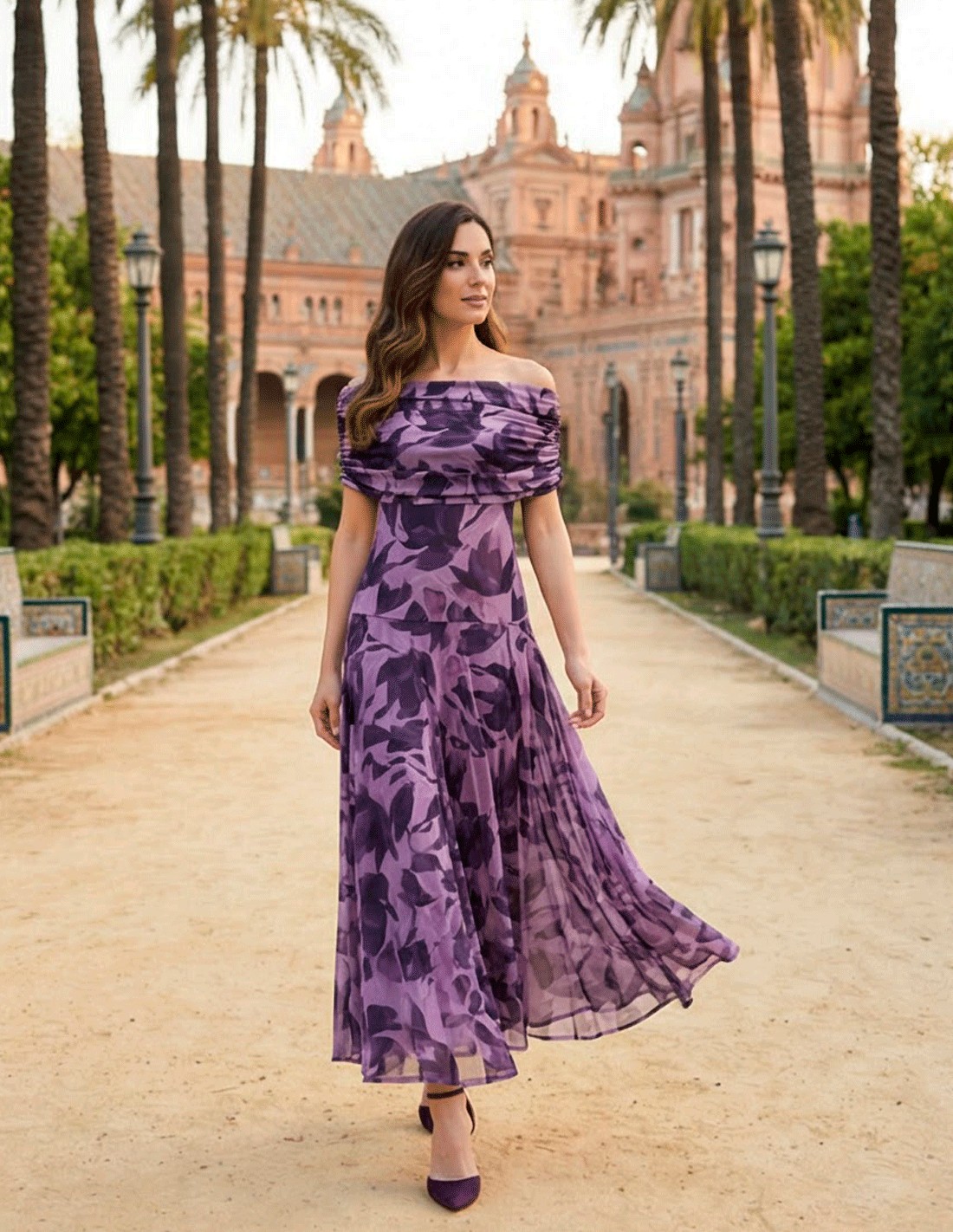 Robe violette élégante et flatteuse pour les invités d'un mariage en Espagne