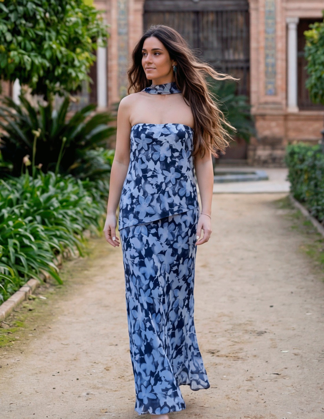Le décolleté sans bretelles met en valeur les épaules et l'encolure, créant une silhouette féminine et élancée. L'imprimé floral dans des tons doux apporte fraîcheur, élégance et un air romantique, parfait pour les mariages et les célébrations.