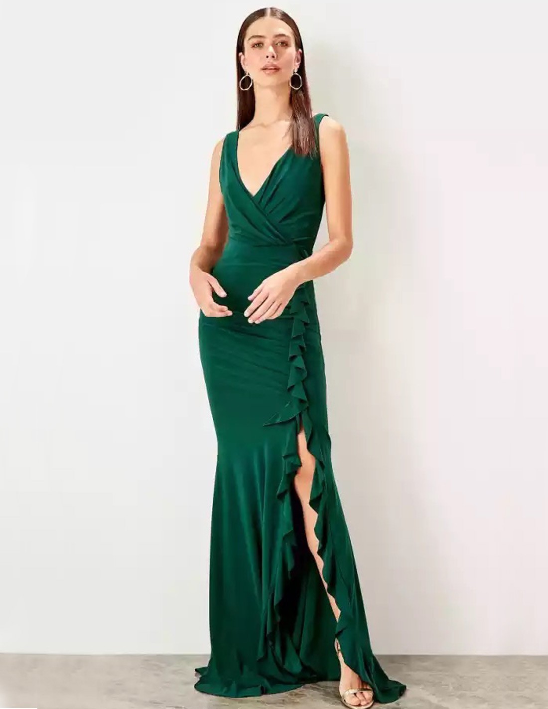 Robe longue de soirée avec décolleté en V et jupe fendue avec détail de volants.