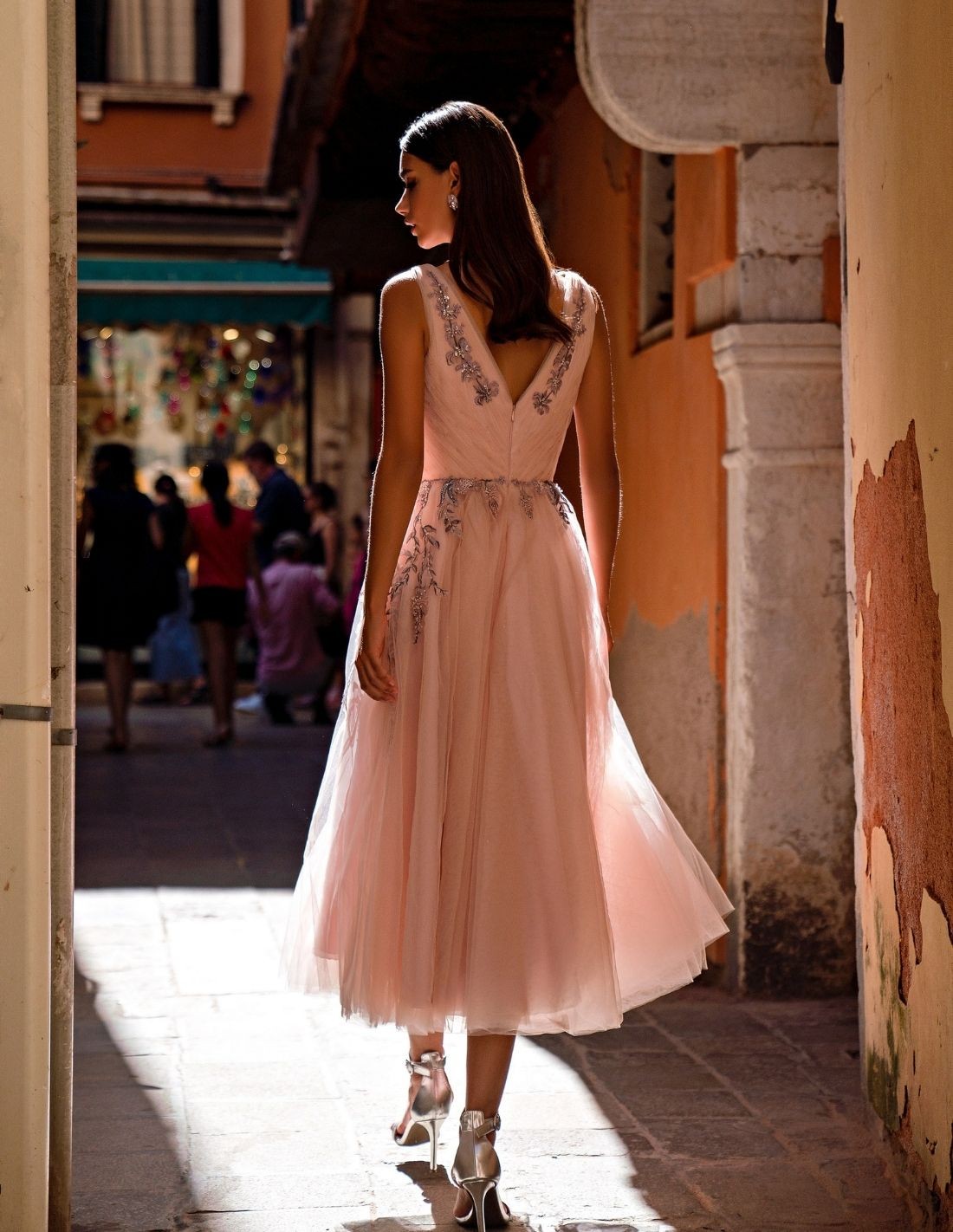 Robe de soirée midi rose poudré avec jupe en tulle pour les événements spéciaux.