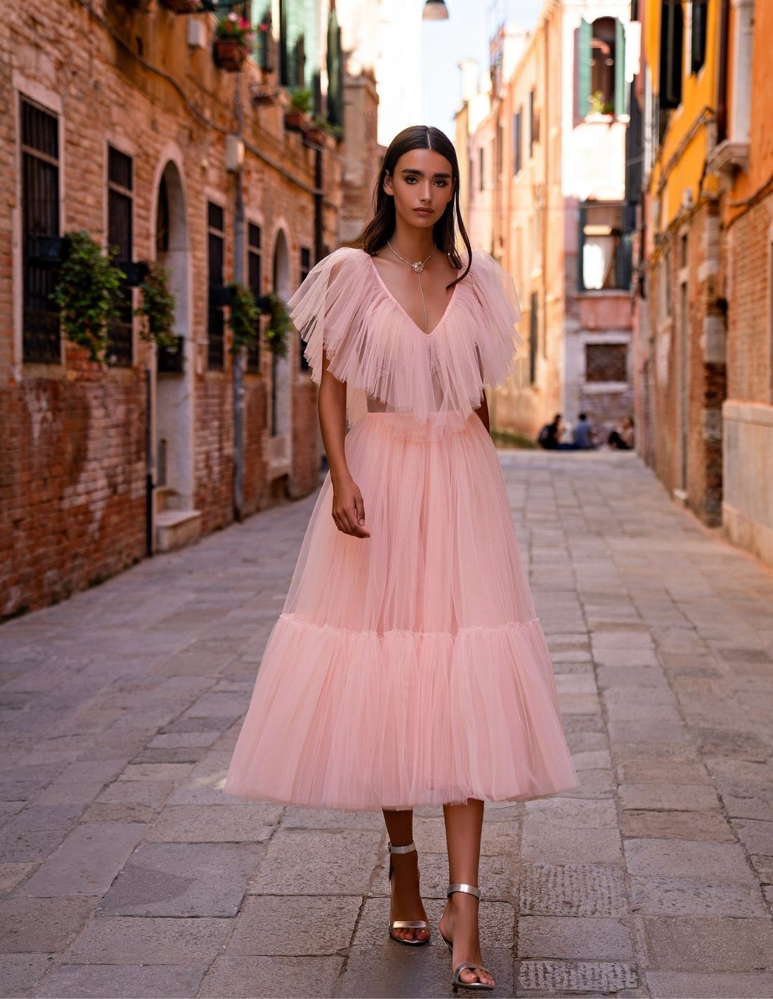 Robe de soirée midi avec volants en tulle