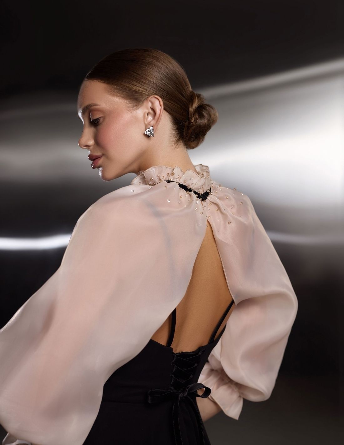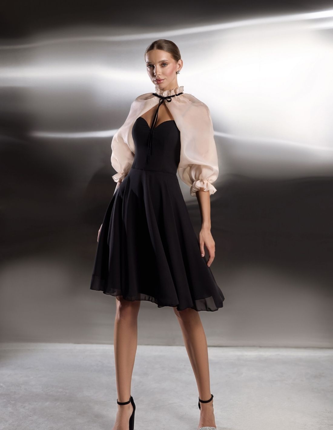 Elle présente un décolleté en cœur avec un corsage ajusté qui épouse la silhouette, tandis que la jupe trapèze tombe délicatement juste au-dessus du genou. La cape en organza de couleur nude qui couvre les épaules et les bras ajoute une touche très spéciale à la tenue. La cape est ornée d'un nœud noir qui se noue à l'encolure et les manches bouffantes de la cape se terminent par de délicats poignets à volants, ajoutant une touche romantique et contemporaine au modèle.