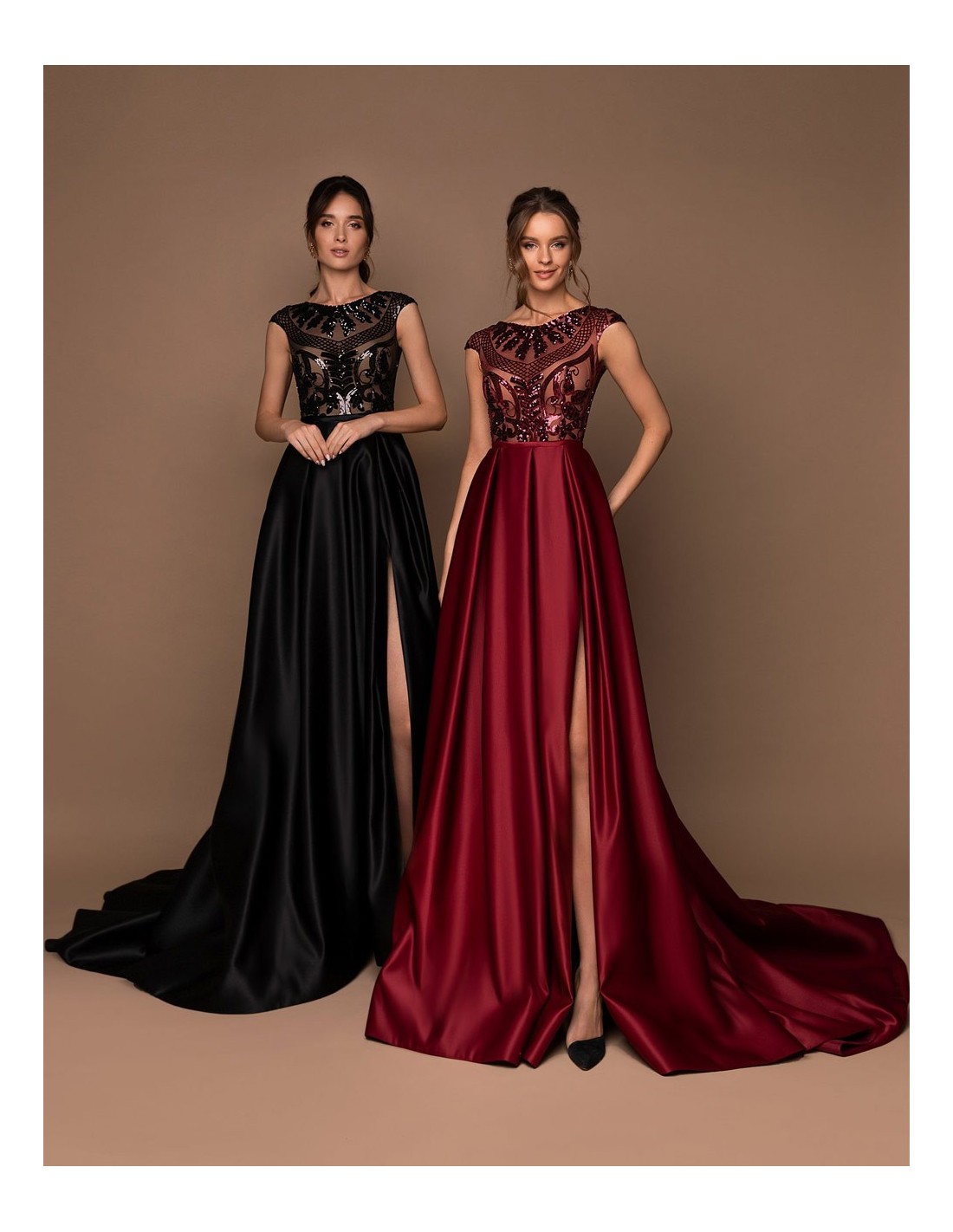 Exquiserobe longue de fête dotée d'une superbe jupe à volants en satin et d'un corsage décoré de sequins cousus à la main.