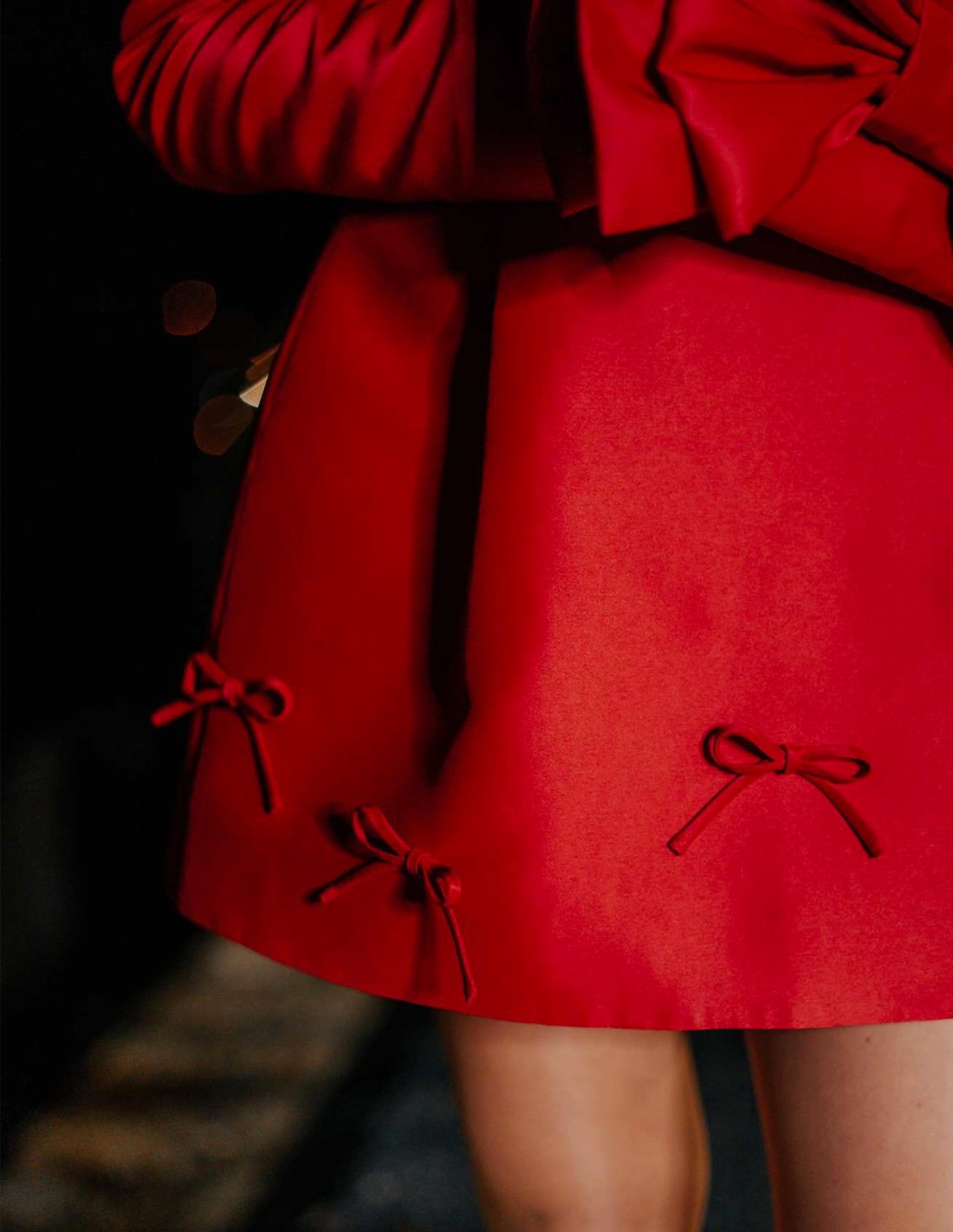 Mini robe de soirée avec encolure bardot et détails de nœuds en rouge.