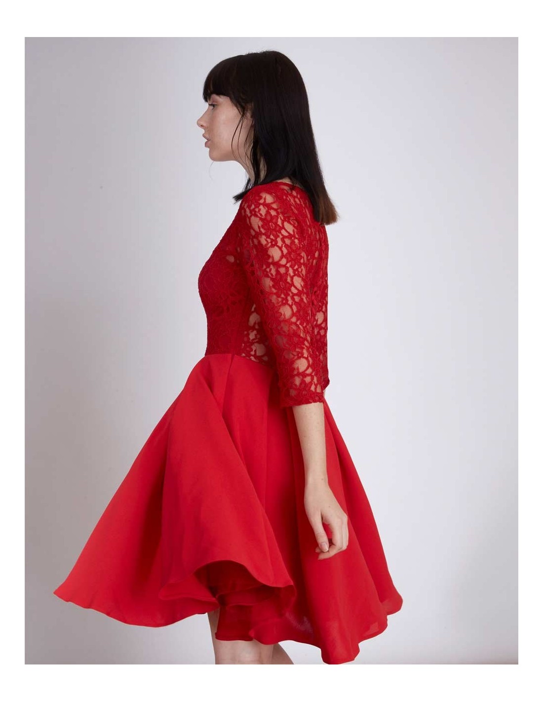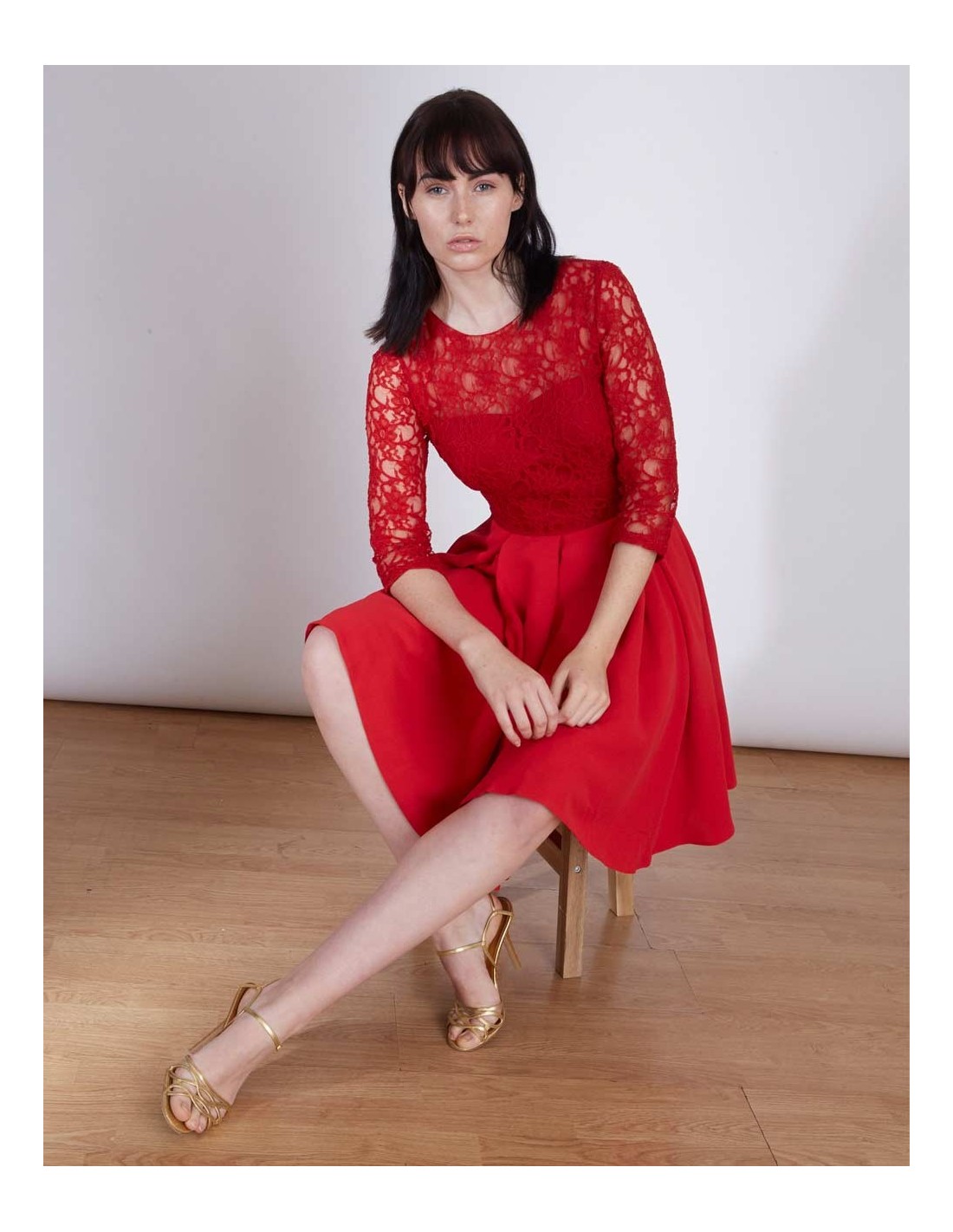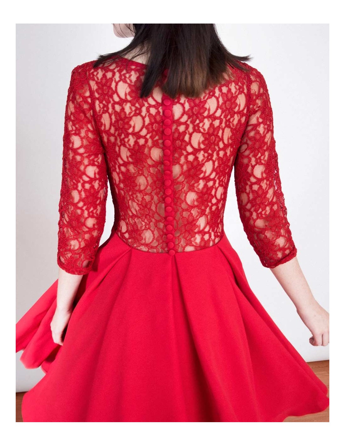 La robe de cocktail Helena est parfaite pour les invitées à des événements matinaux tels que les mariages, mais aussi les fêtes et les remises de diplômes. Elle est dotée d'un magnifique corsage en dentelle, complété par une étonnante jupe flottante. Associez-la à des sandales à lanières. Avec le rouge intense de cette robe, vous pouvez combiner des couleurs comme le bleu Klein, le nude ou le beige avec le même rouge et créer un look "total red".