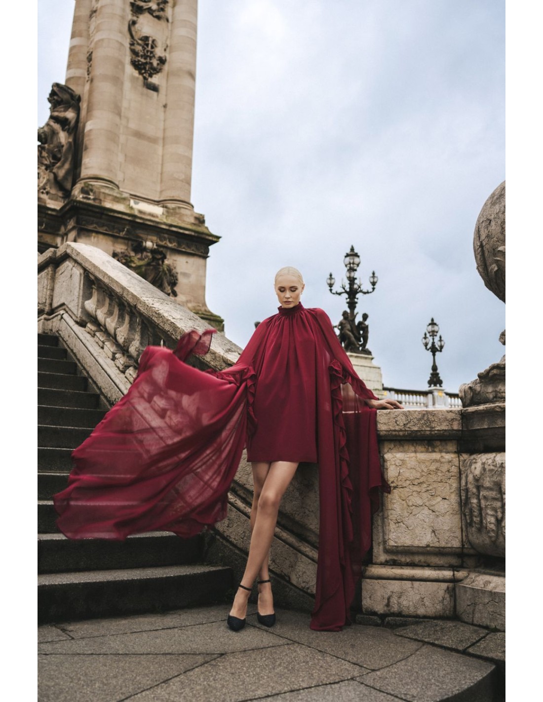 Robe courte en mousseline de soie bordeaux avec manches maxi et volants