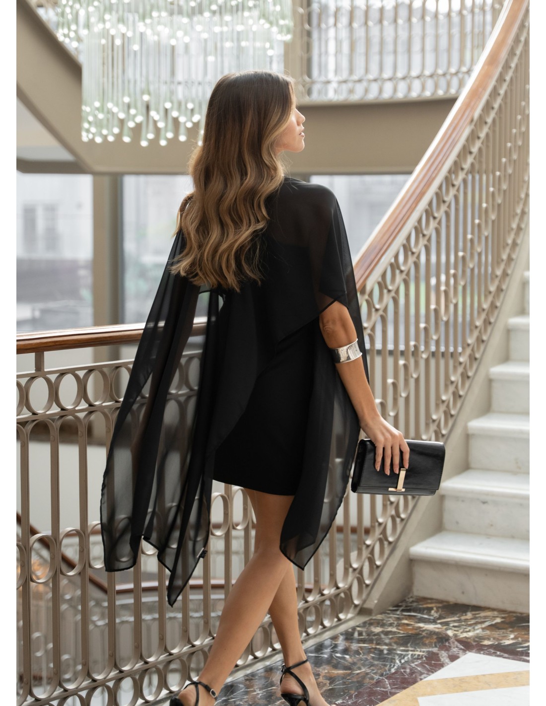 Robe de soirée noire courte avec encolure asymétrique et cape
