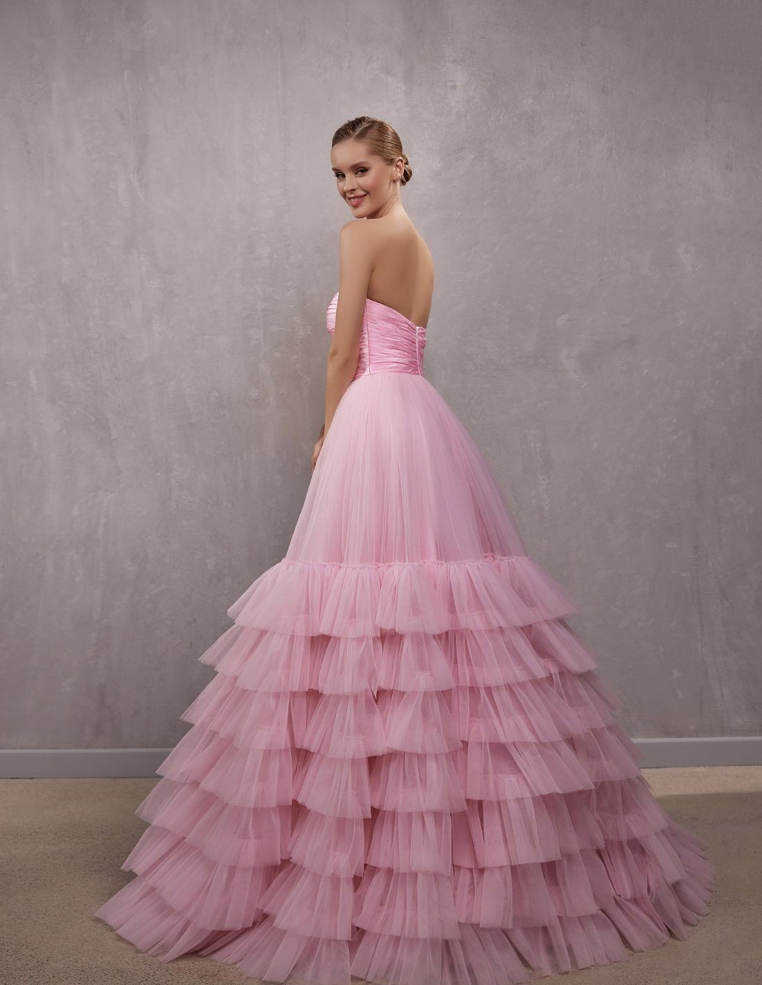 Ce modèle spectaculaire pour invités spéciaux présente un corsage drapé avec encolure sans bretelles et une jupe maxi avec plusieurs couches de tulle rose bubblegum. Elle se ferme dans le dos par une fermeture éclair invisible.
