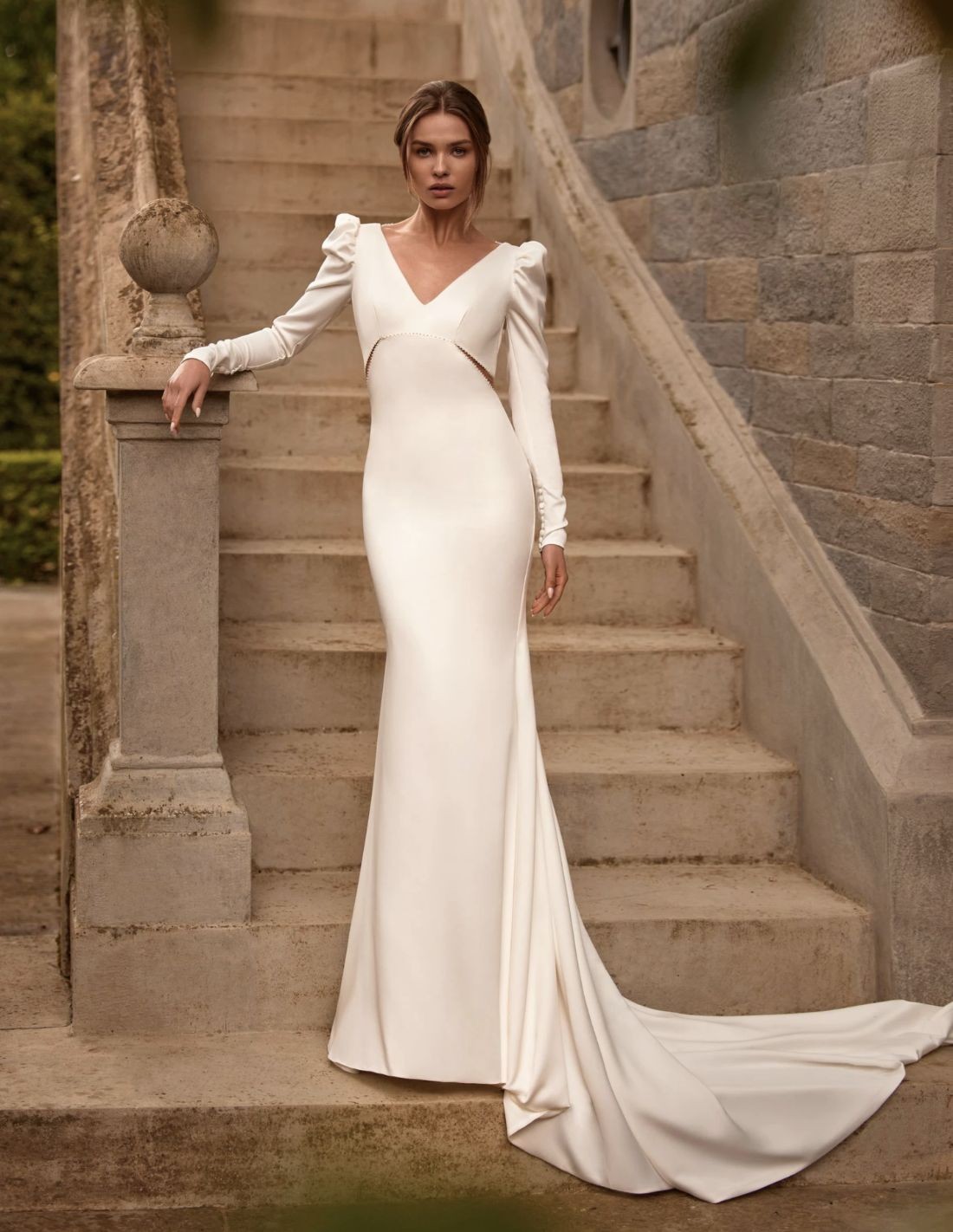 Robe de mariée à fentes et silhouette de sirène avec grande traîne et un délicat collier de strass détachable dans le dos. Les fentes sont dotées d'une maille qui empêche la robe de se déformer et garantit un ajustement parfait