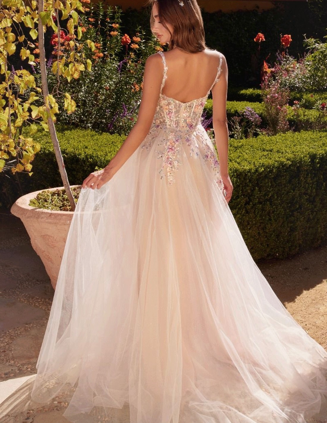 Cette Robe est la combinaison parfaite de l'élégance et du romantisme. Le corsage est en tulle brodé de fleurs multicolores dans les tons rose et mauve, avec de petits éclats qui lui donnent une touche de glamour. L'encolure est cache-coeur et les fines bretelles peuvent être ajustées pour un meilleur ajustement. La jupe est en tulle princesse multicouche, qui vous donnera un mouvement léger et fluide lorsque vous marcherez.