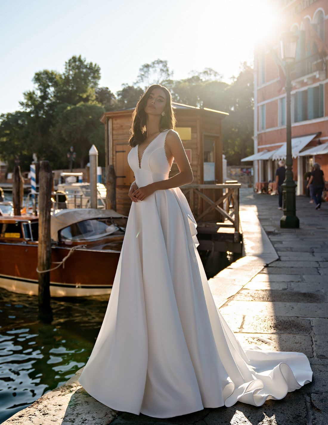Robe de mariée en satin avec un décolleté plongeant et un maxi dos lacé