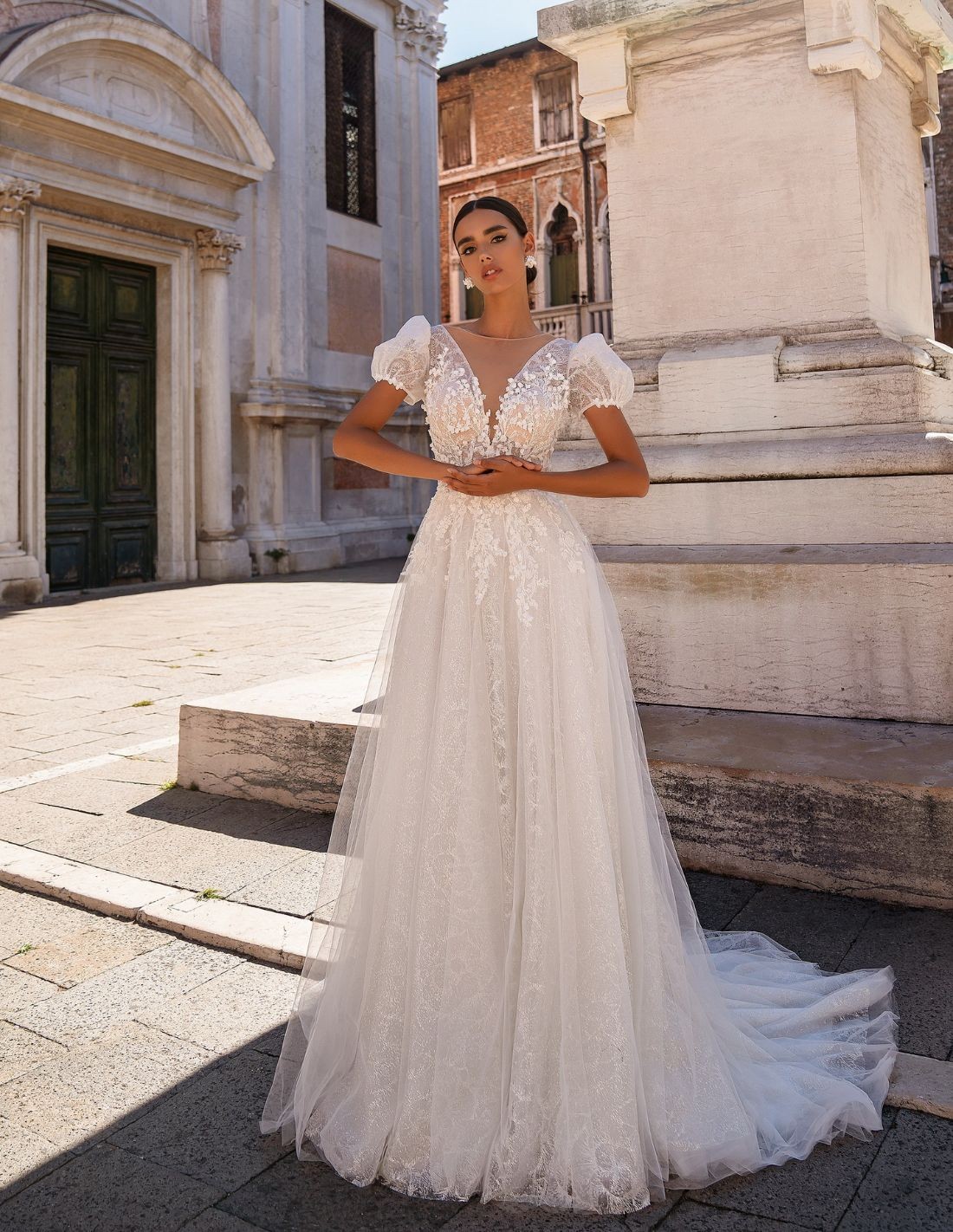 Une pièce romantique et délicate, idéale pour la mariée qui recherche un style classique avec des détails modernes. Le décolleté en V, recouvert de maille nude, ajoute une touche subtile de sensualité tout en restant élégant. Les courtes manches lanternes ajoutent un air de féminité et de douceur, complétant parfaitement le corsage de la robe.