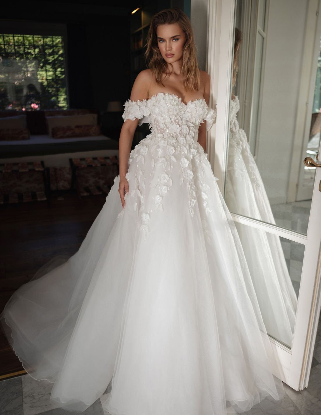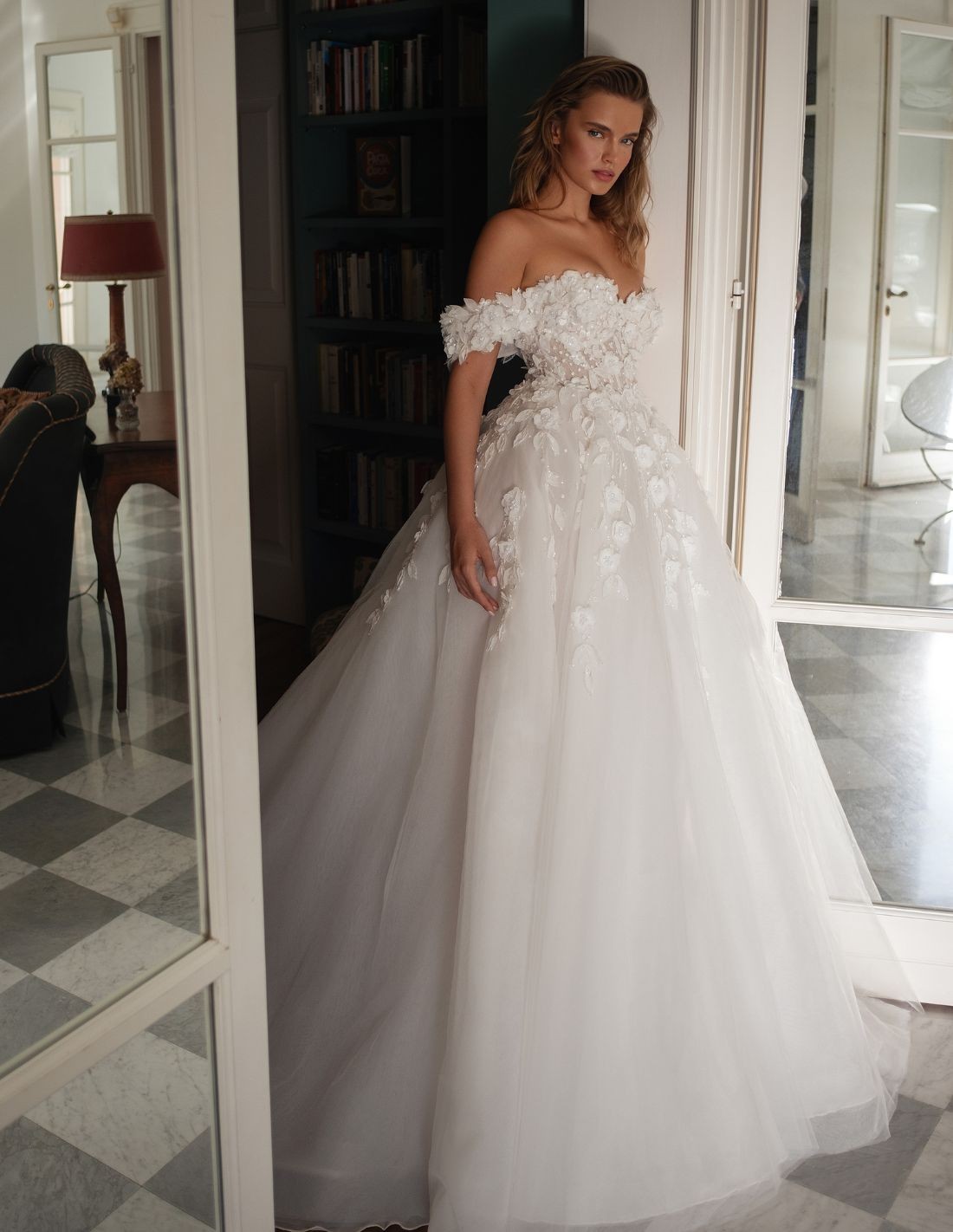 Robe de mariée longue avec encolure bandeau et corsage fleuri