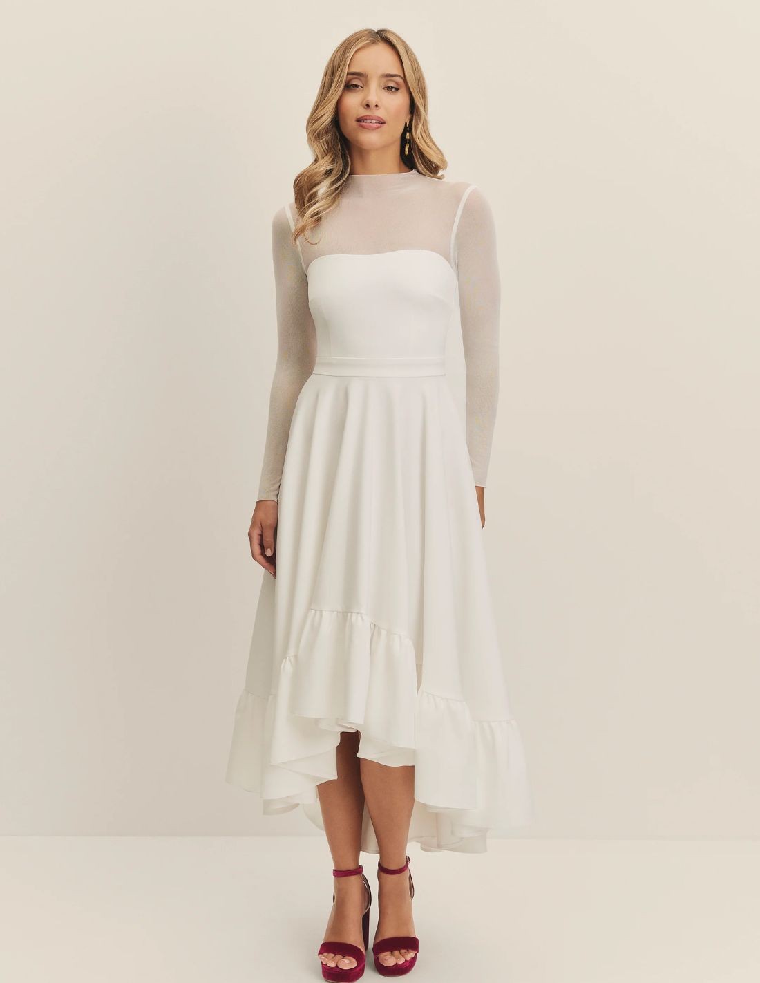 Robe de mariée midi avec encolure en cœur et jupe asymétrique