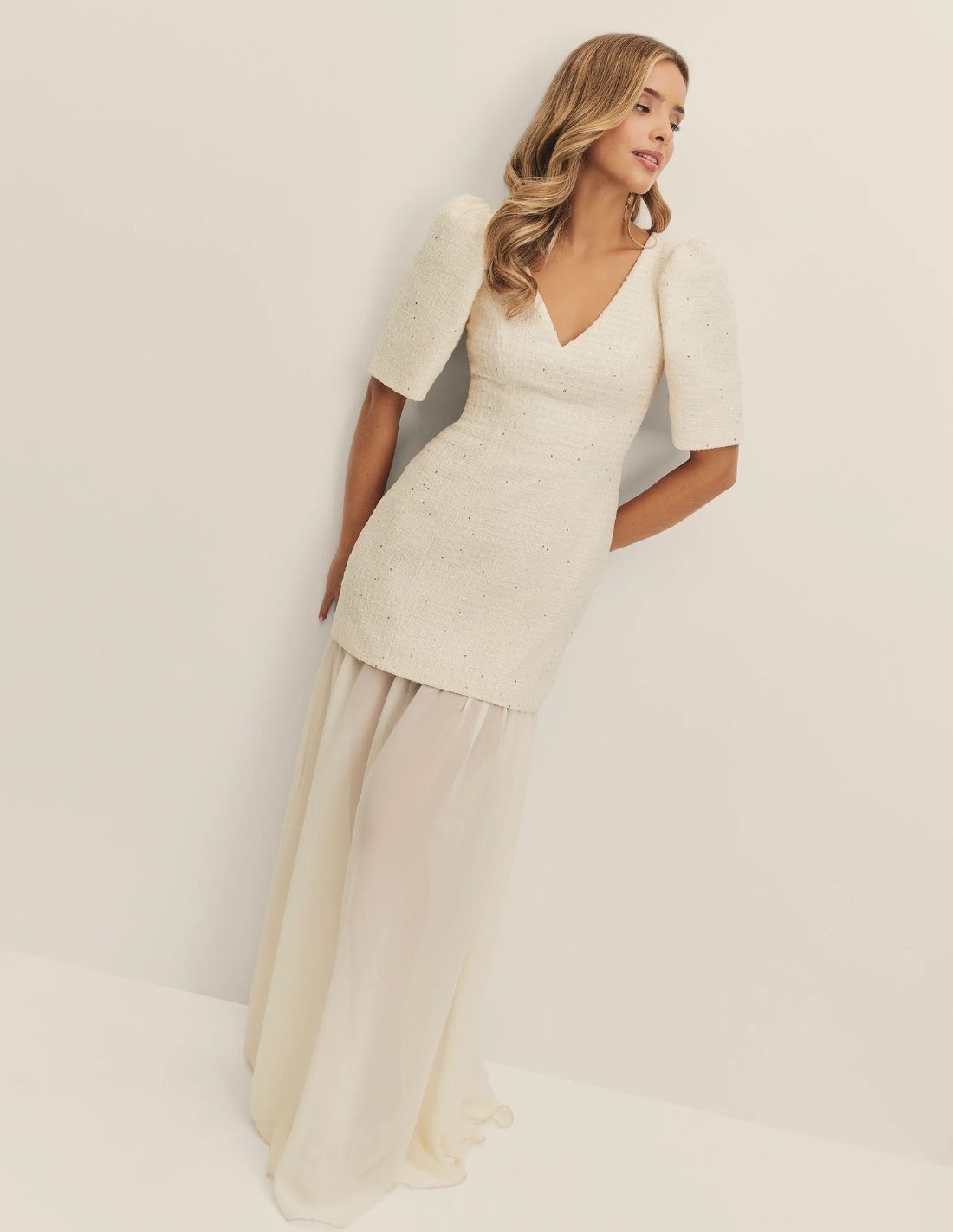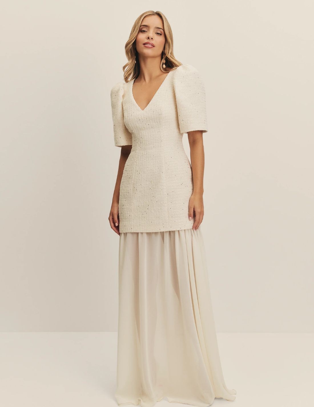 Robe de mariée en tweed et mousseline de soie avec manches bouffantes